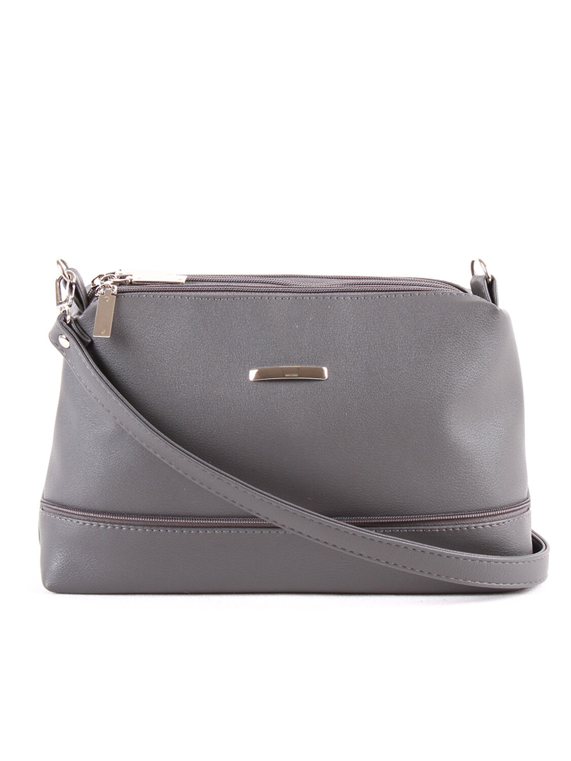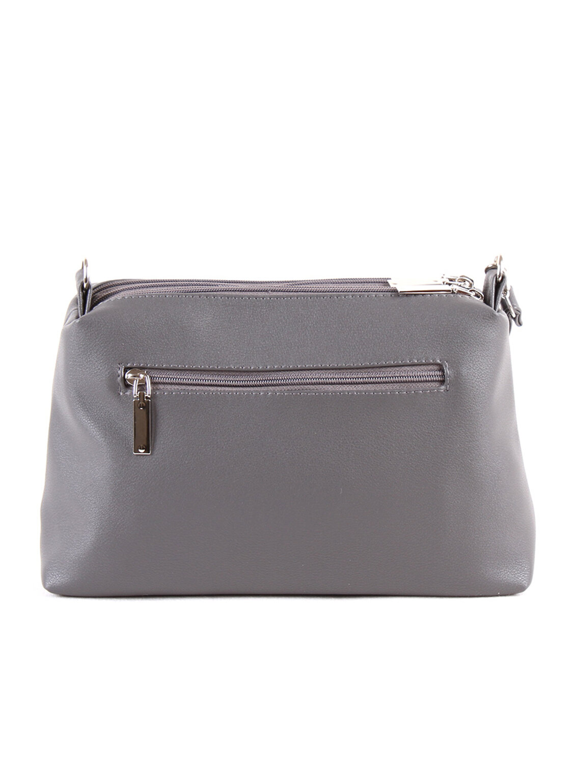 Сумка женская , мягкая, с тремя отделениями на молнии. На задней стенке - карман на молнии. Внутри - два кармана на молнии. Несъемный ремень регулируется от 73 до 135 см. Серый