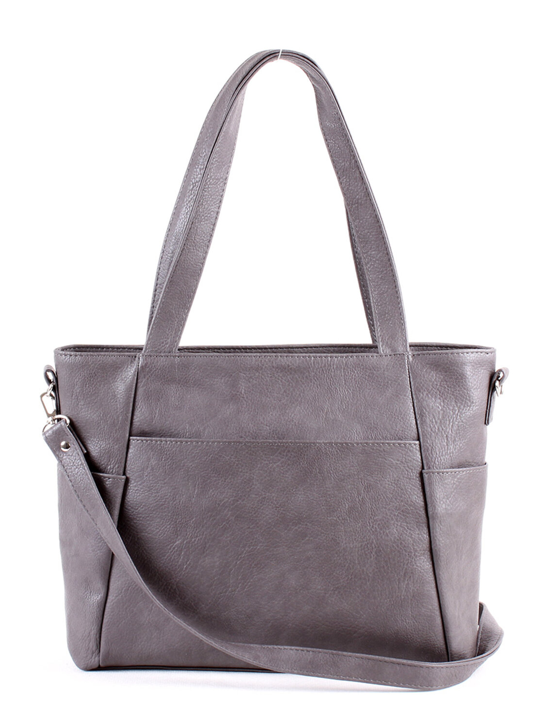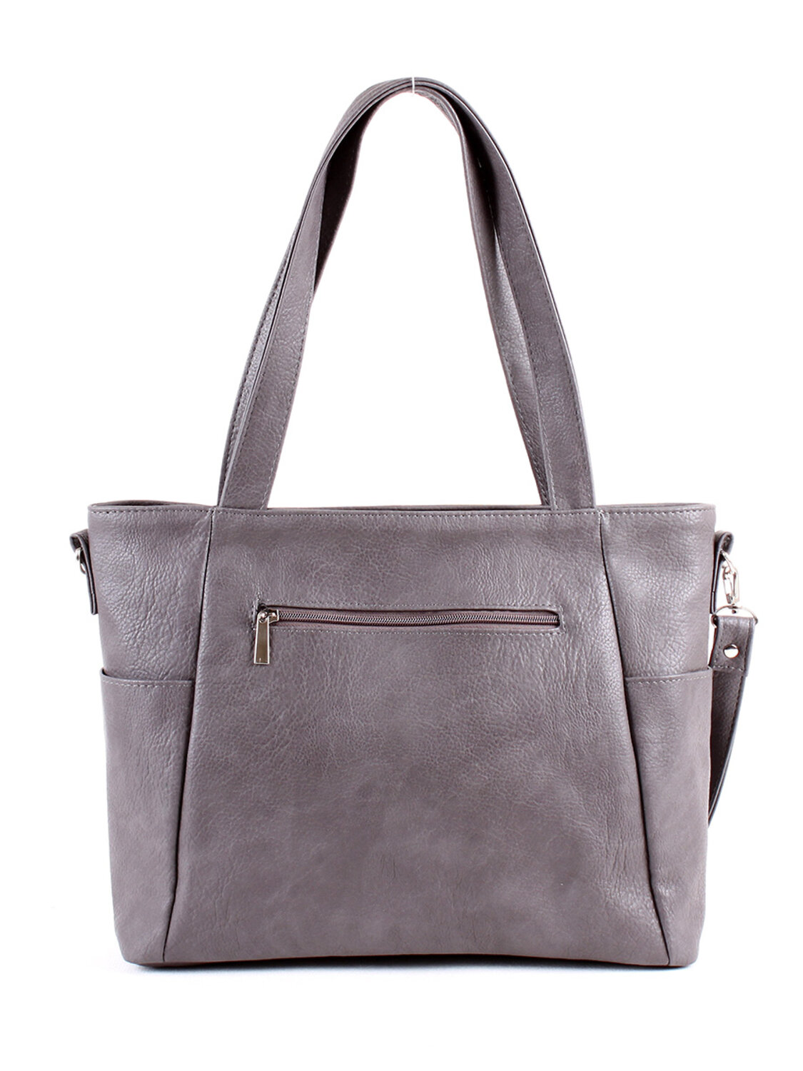 Сумка женская с одним отделением на молнии. Вмещает формат А4. На передней стенке - карман на магнитной кнопке и скрытый в нём карман на молнии. Два открытых боковых кармана. На задней стенке - карман на молнии. Высота ручек - 27 см. Максимальная длина съемного регулируемого ремня - 125 см. Серый