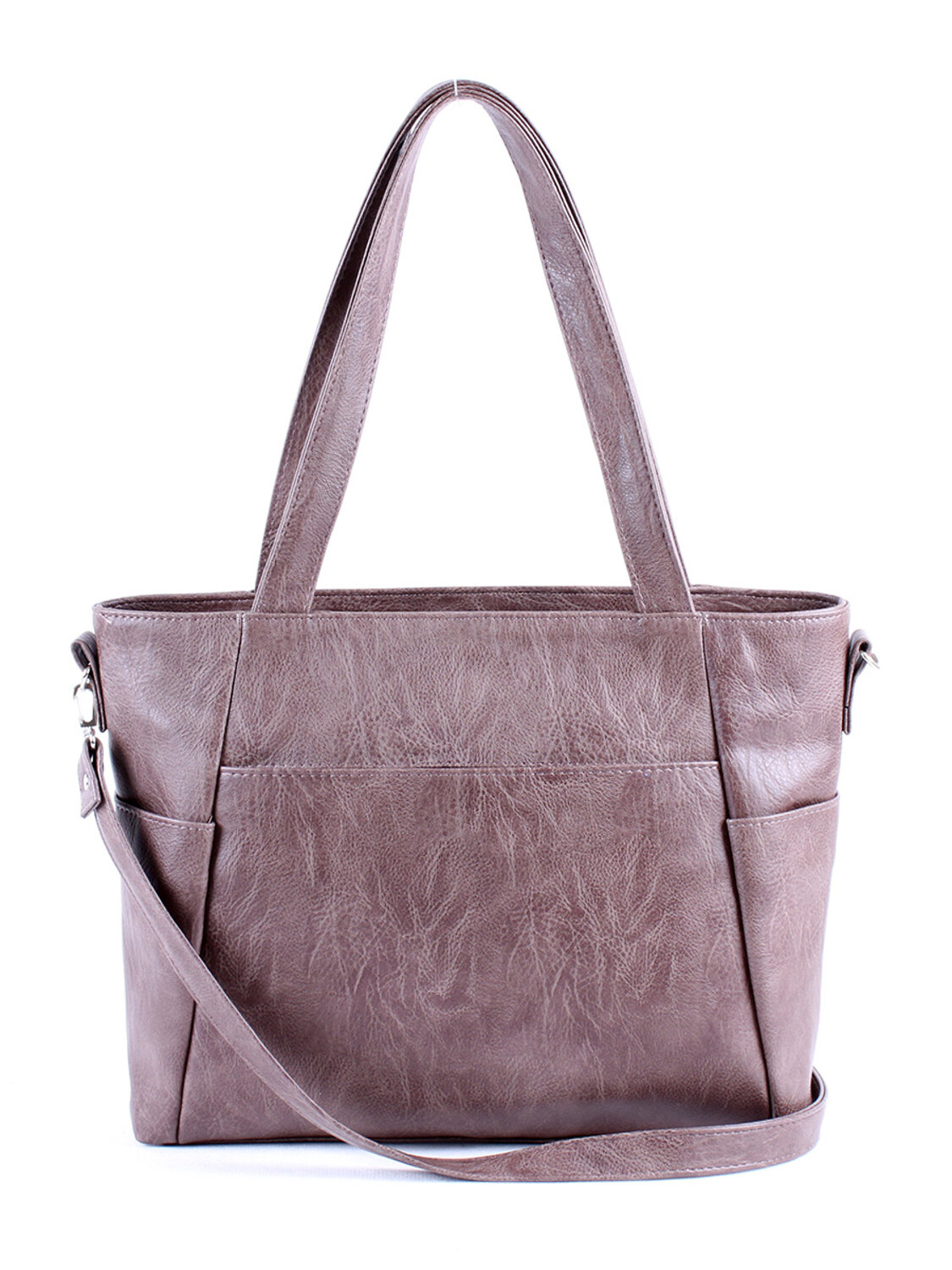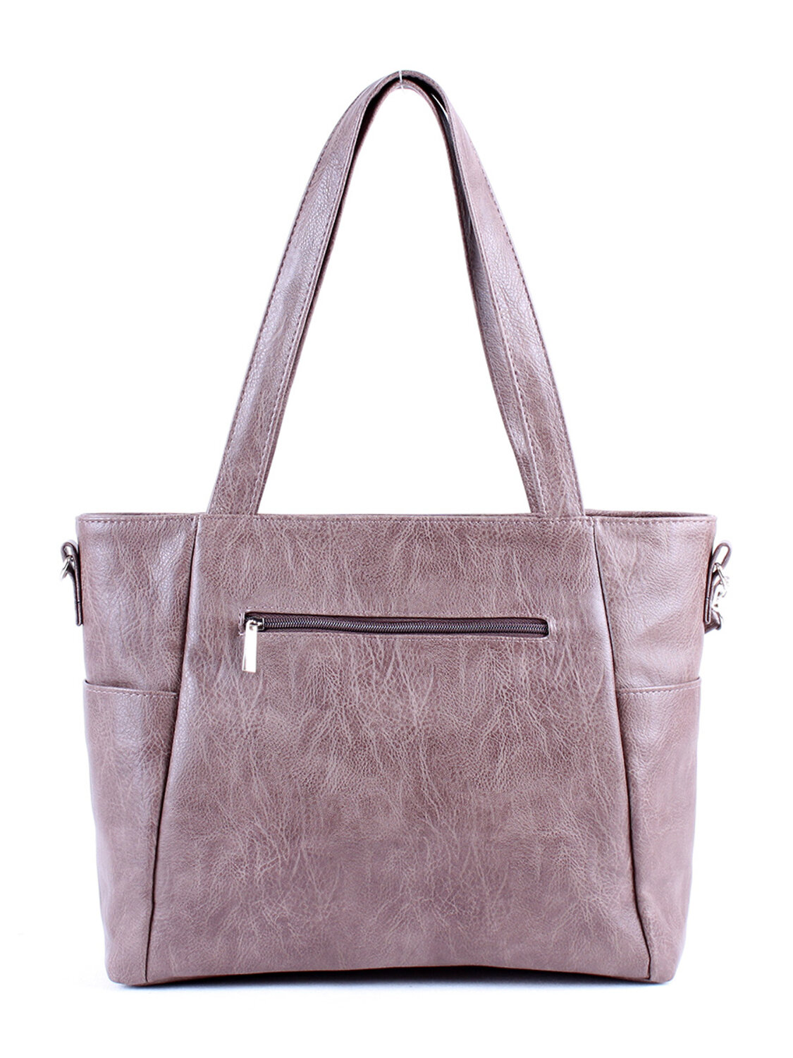 Сумка женская с одним отделением на молнии. Вмещает формат А4. На передней стенке - карман на магнитной кнопке и скрытый в нём карман на молнии. Два открытых боковых кармана. На задней стенке - карман на молнии. Высота ручек - 27 см. Максимальная длина съемного регулируемого ремня - 125 см. Какао