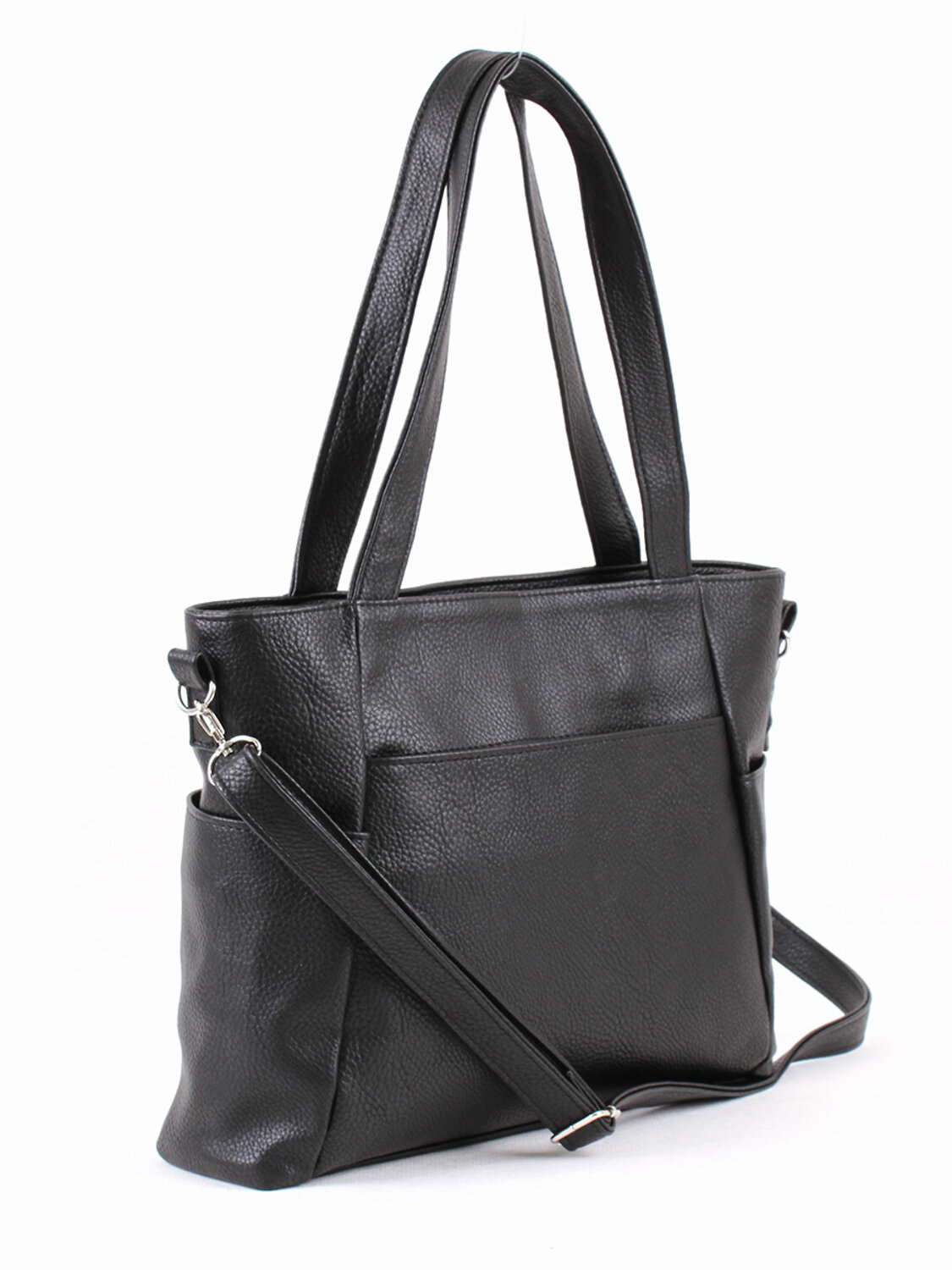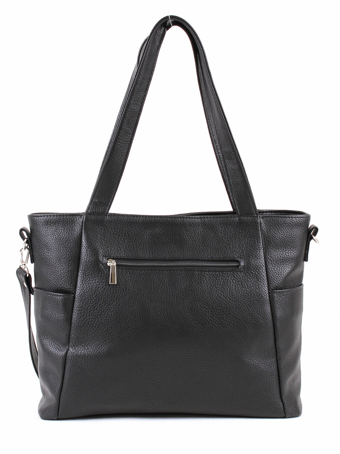Сумка женская с одним отделением на молнии. Вмещает формат А4. На передней стенке - карман на магнитной кнопке и скрытый в нём карман на молнии. Два открытых боковых кармана. На задней стенке - карман на молнии. Высота ручек - 27 см. Максимальная длина съемного регулируемого ремня - 125 см. Черный