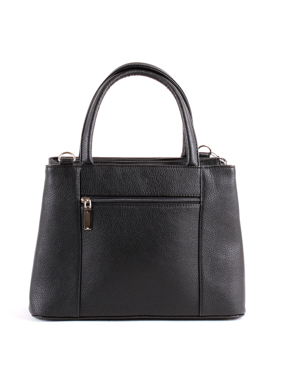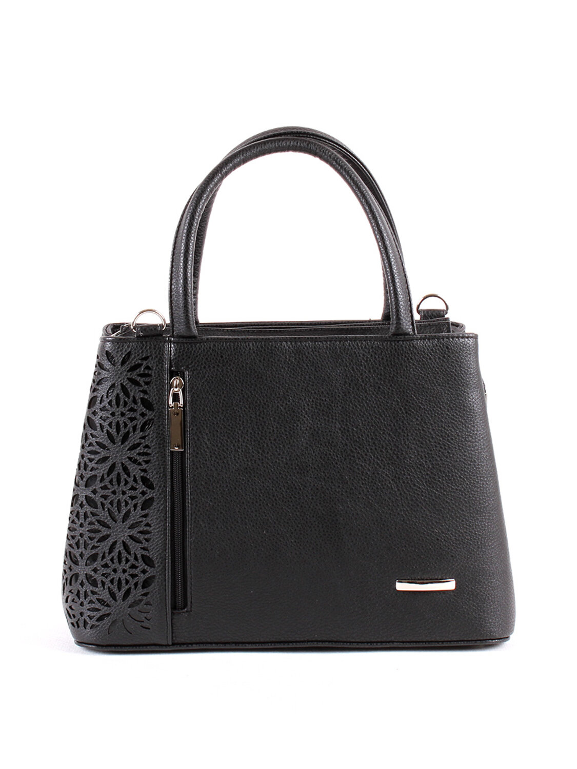 Сумка женская, украшенная перфорацией на передней стенке, с двумя отделениями под одной общей молнией. На передней стенке- вертикальный, на задней - горизонтальный карманы на молнии. В каждом отделении - карман на молнии. Высота ручек 14,5 см. Максимальная длина съемного регулируемого ремня 130 см. Черный
