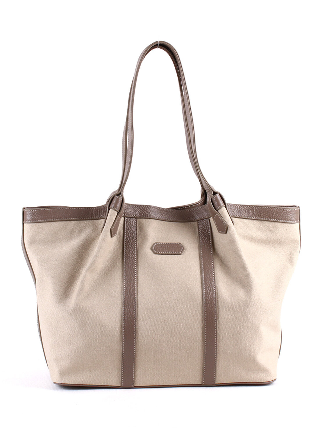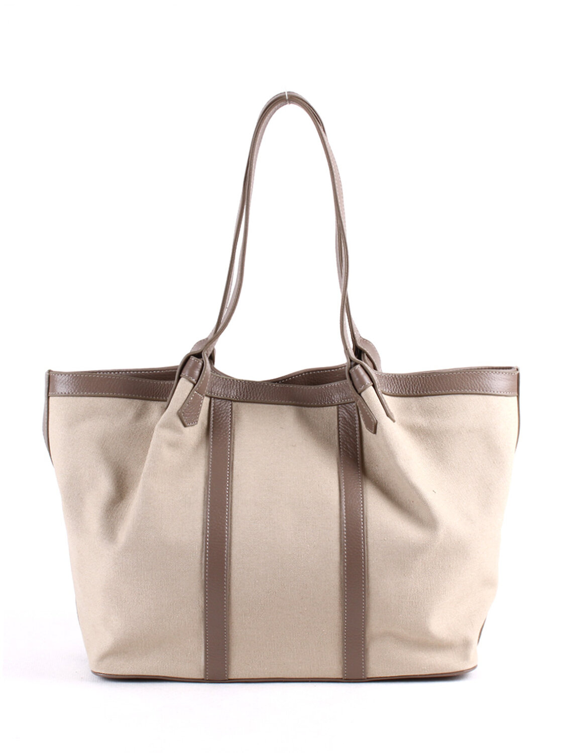 Мягкая вместительная женская сумка из текстильного материала с отделкой из натуральной кожи. Внутри - два открытых кармана для мелочей и карман на молнии для документов. Высота ручек - 25 см. Бежевый/Т.бежевый