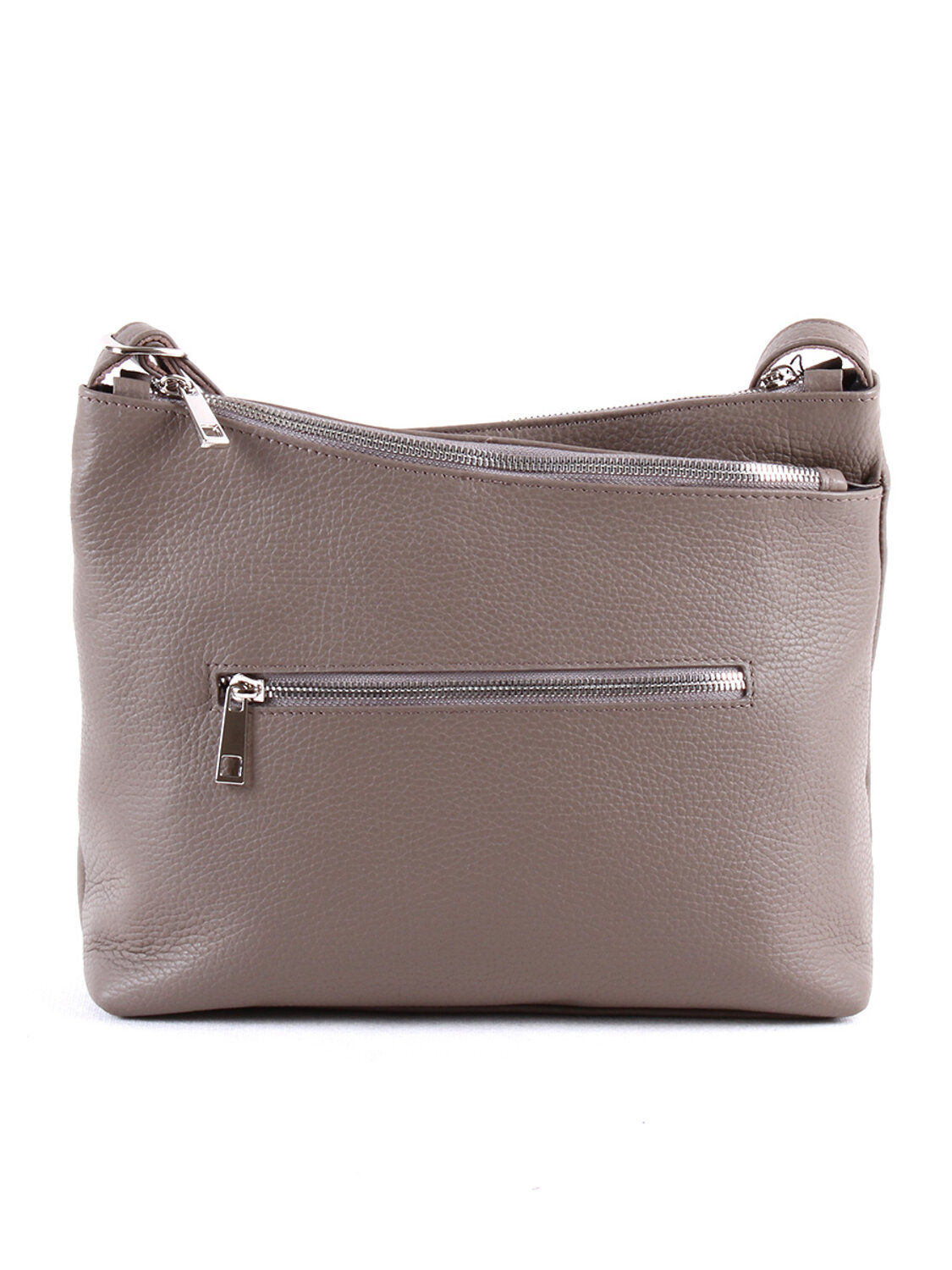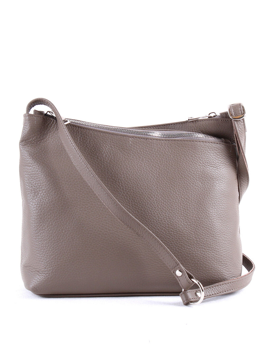 Сумка с тремя отделениями, два закрываются на молнии, одно - на магн.кнопку. Внутри карман д\сотового и карман на молнии. На задней стенке карман на молнии. Высота ручки 65см. Т.бежевый