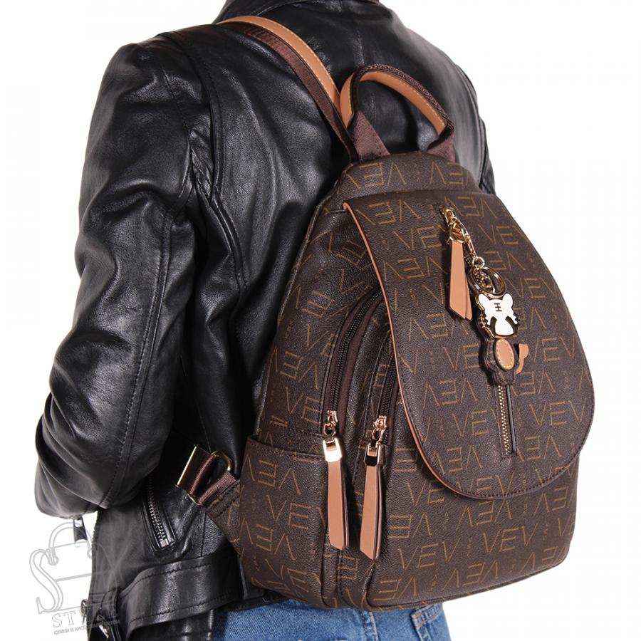 Снаружи закрывается на клапан на кнопку. На клапане декоративная молния со съемным брелоком. Под ним отдел на молнии и карман на молнии.