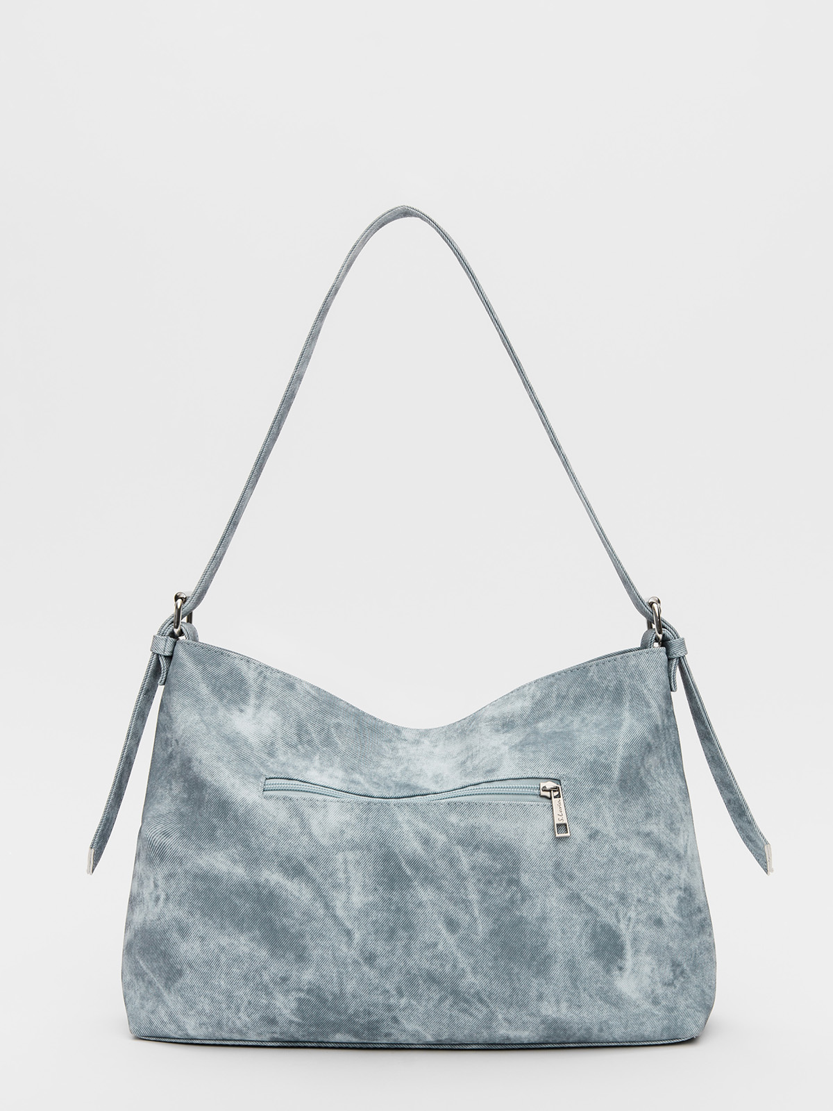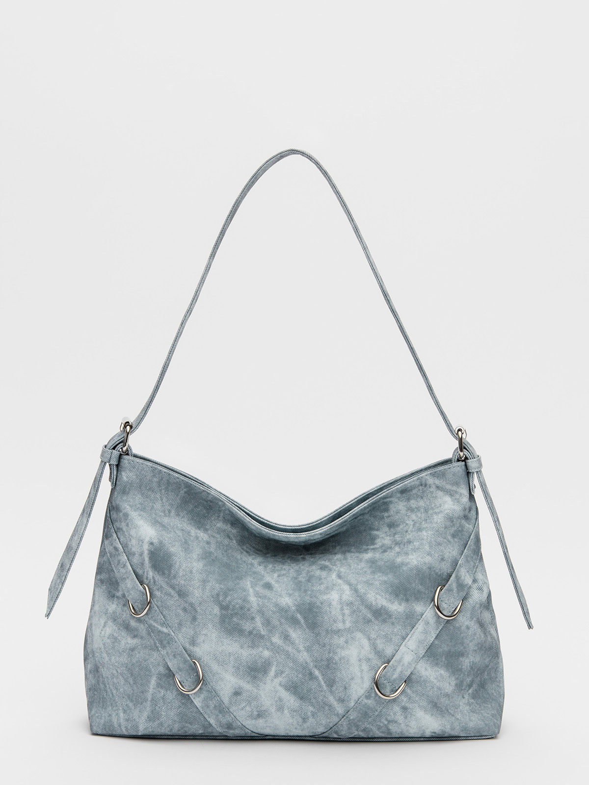 Элегантная форма хобо с декоративными ремнями и металлической фурнитурой представлена в голубом оттенке. Сочетание винилискожи с отделкой под деним и эффектом тай-дай делает модель стильным акцентом в любом образе.