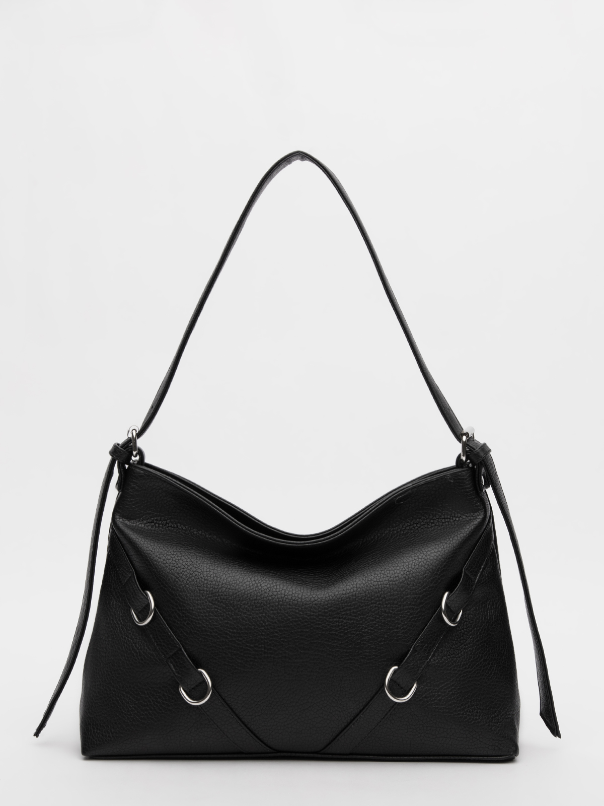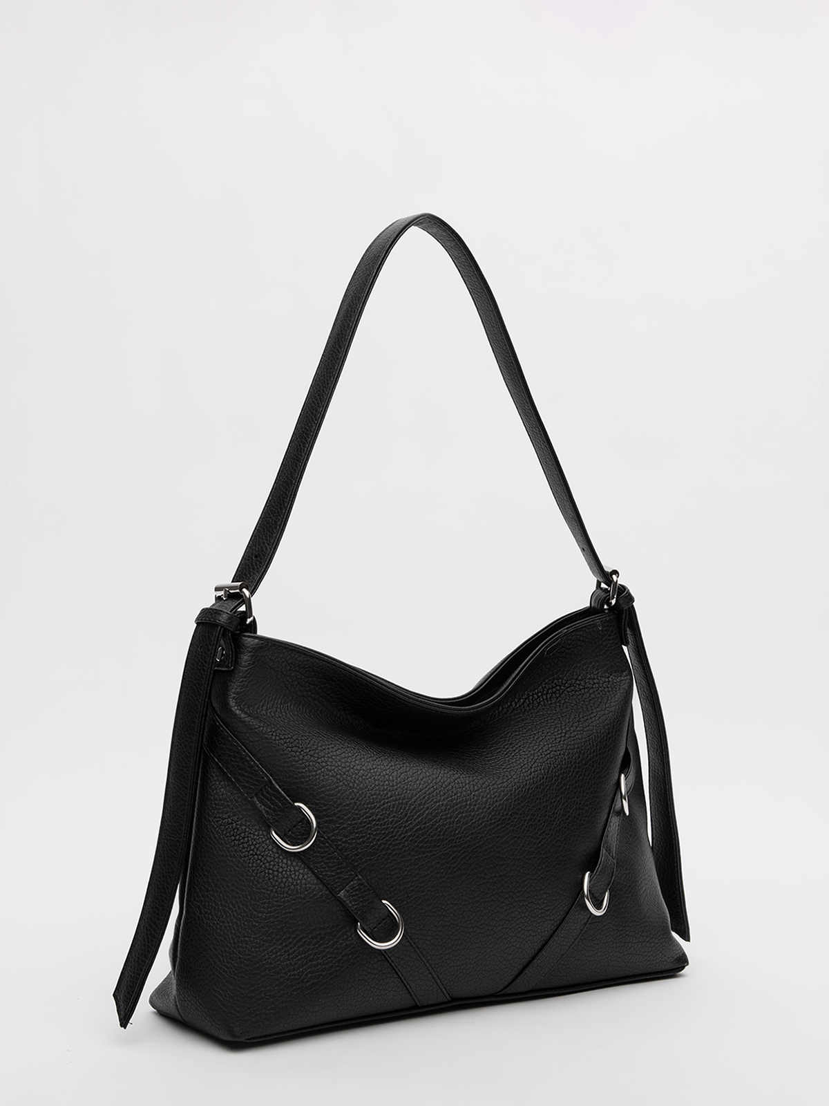 Элегантная форма хобо с декоративными ремнями и металлической фурнитурой представлена в классическом чёрном цвете.