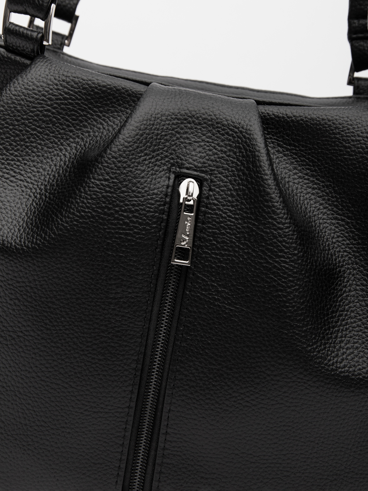 Трендовый силуэт вытянутого прямоугольника со стильными складками создаёт дополнительный объём и добавляет образу лёгкую женственность. Удобные ручки средней длины и съёмный ремень предлагают варианты ношения — от классического до более свободного. Литой декор и брендированная фурнитура подчёркивают статусность аксессуара.