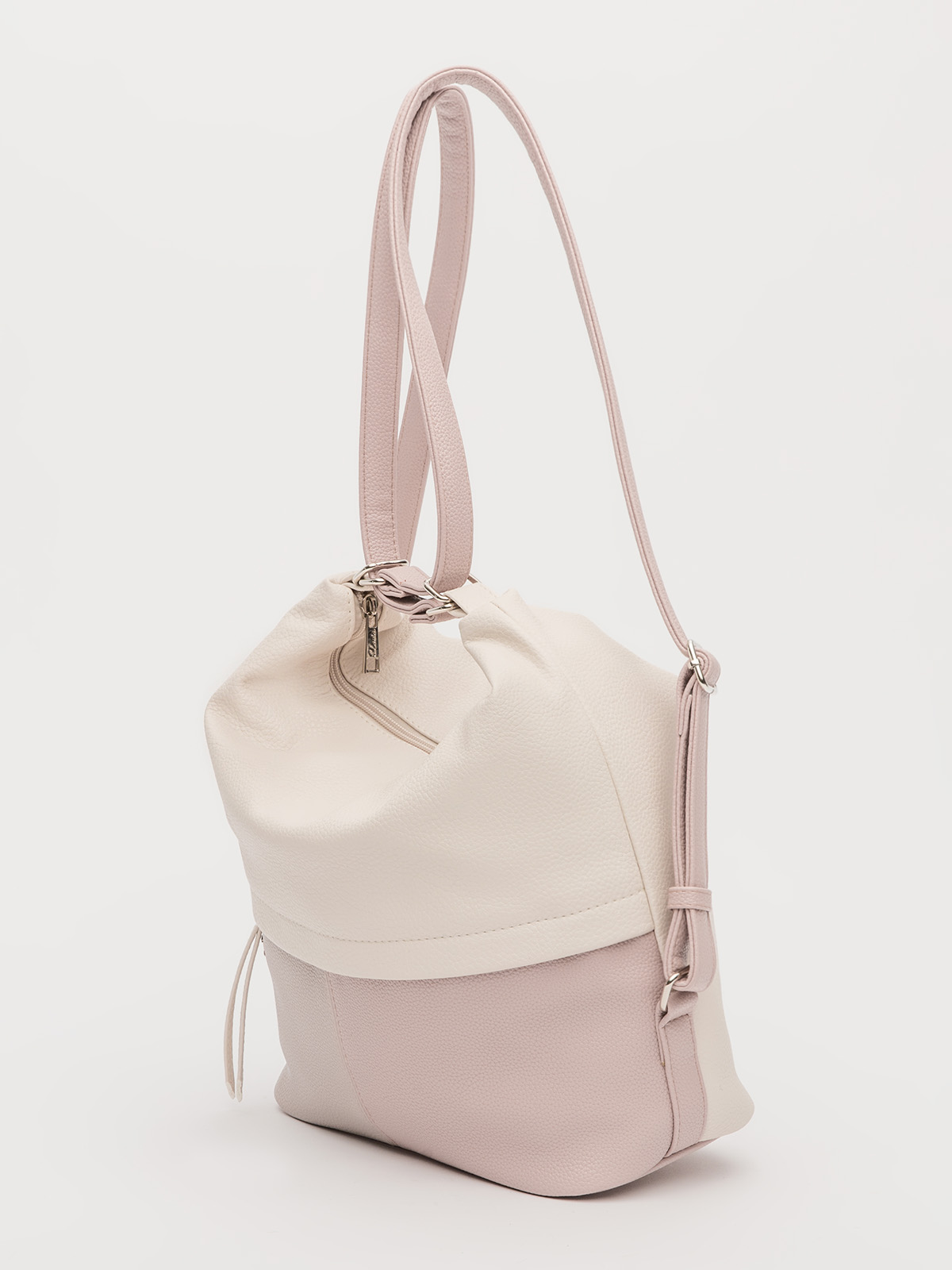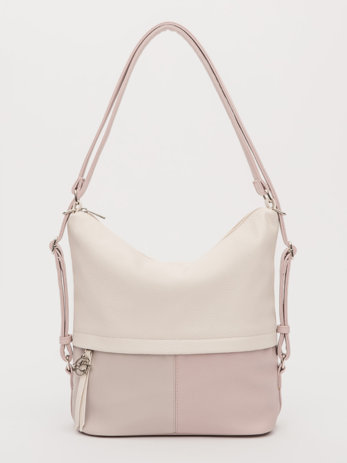 Модель легко меняет форму, позволяя носить её на плече, через плечо или как рюкзак — в зависимости от ситуации. Сочетание нескольких цветов делает сумку стильным акцентом в любом образе. Внутри — продуманная организация: основной отдел, карман на молнии для ценных вещей, отделение для телефона и дополнительный большой карман. Функциональность и неординарный дизайн в одной сумке — идеальный выбор для тех, кто ценит комфорт и возможность всегда иметь под рукой всё необходимое.