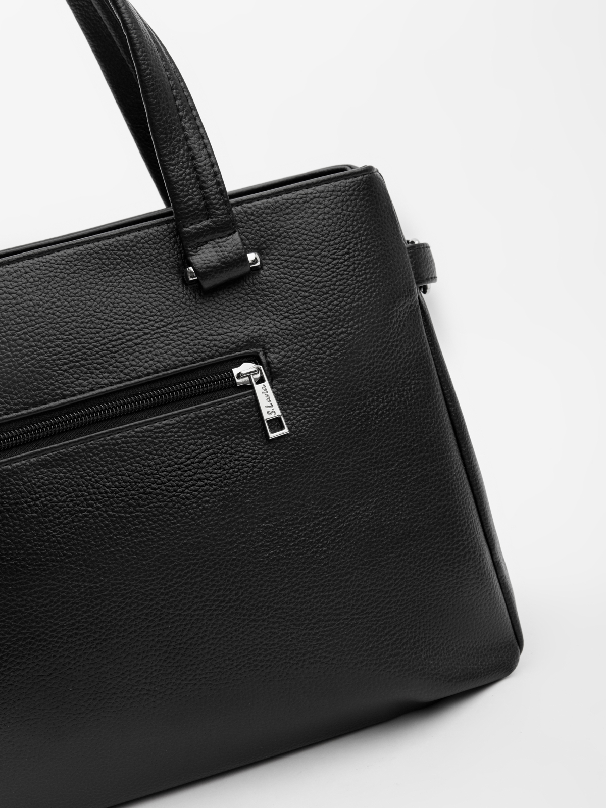 Трапециевидная форма с фигурным подрезом и разрезной передней деталью создает строгий, но выразительный силуэт. Центральный вход на молнии и продуманная внутренняя организация — перегородка с молнией и два стандартных кармана — позволяют удобно разместить все необходимое.