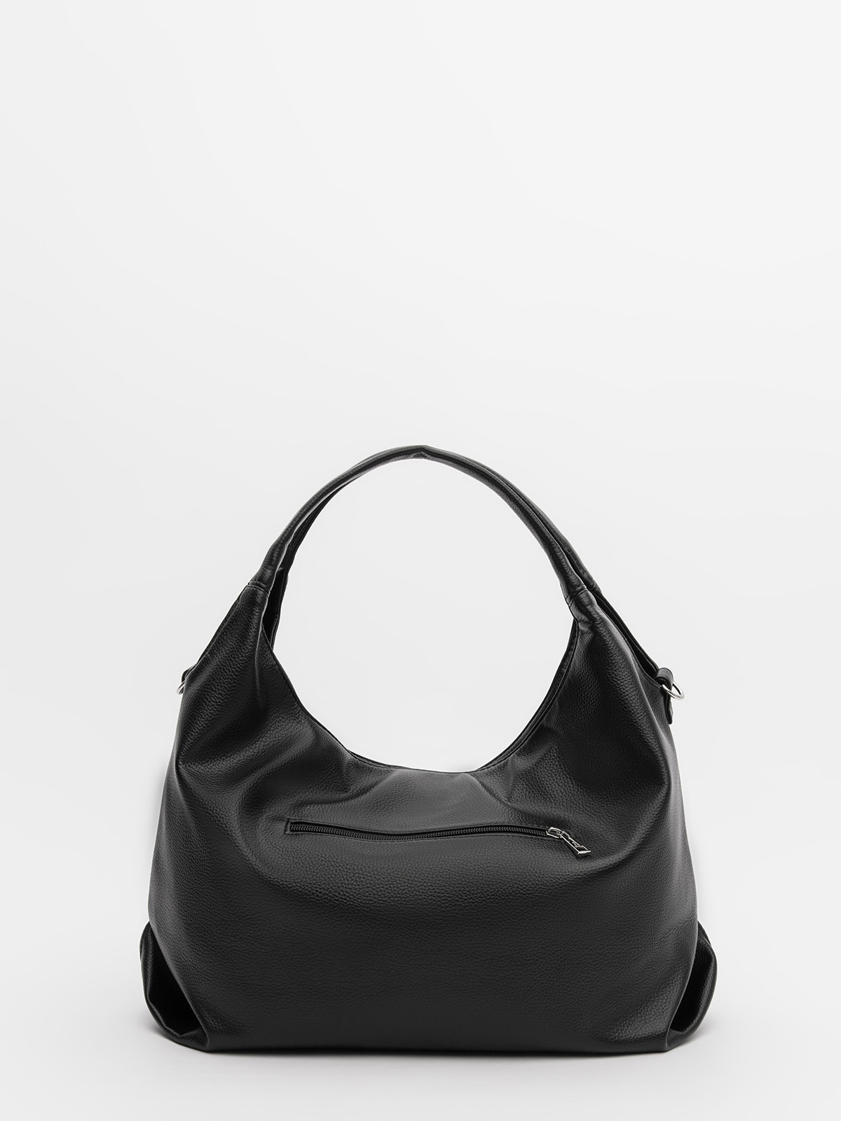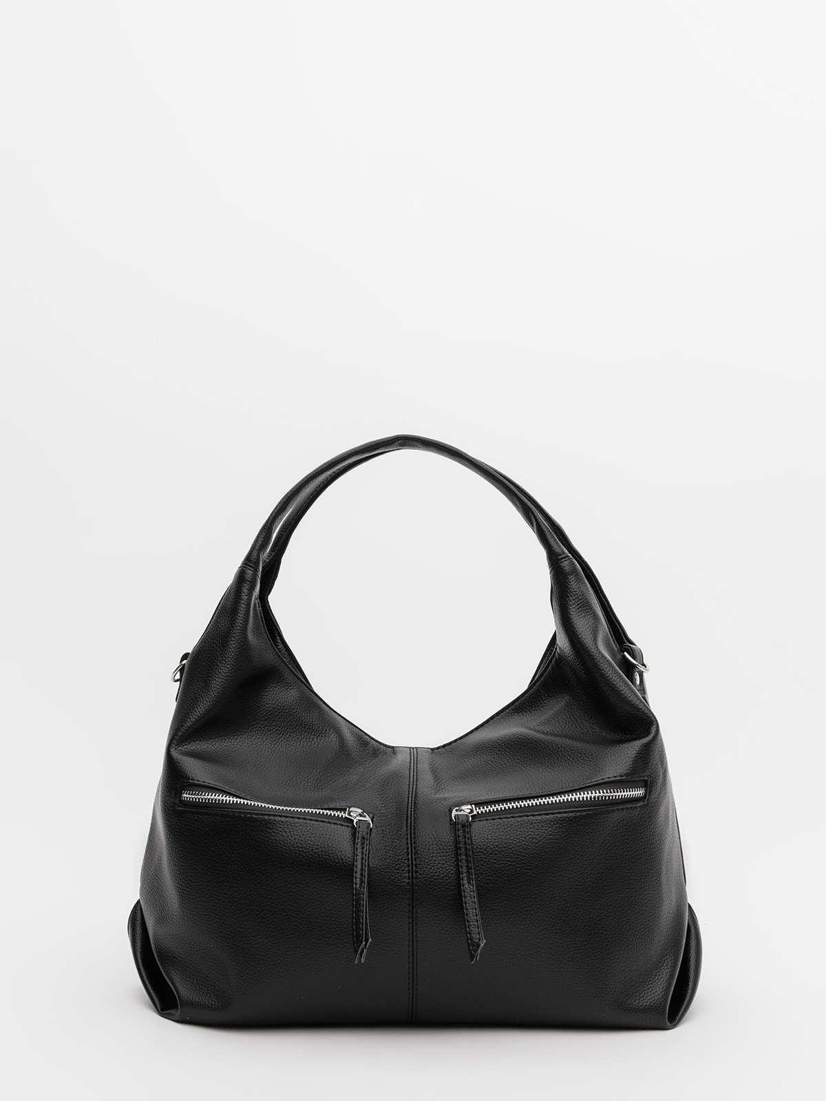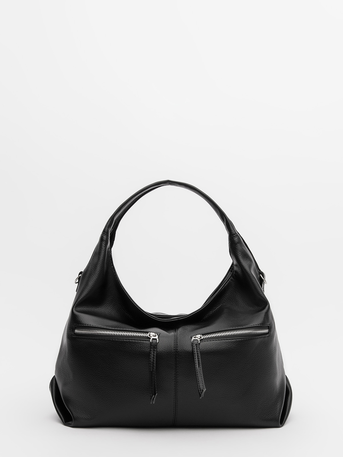 Мягкая форма с разрезной передней частью и двумя карманами на металлической молнии (с кожаными наконечниками бегунков) выглядит объемной, но сохраняет аккуратность. Ручки, плавно переходящие в корпус, создают цельный гармоничный силуэт.