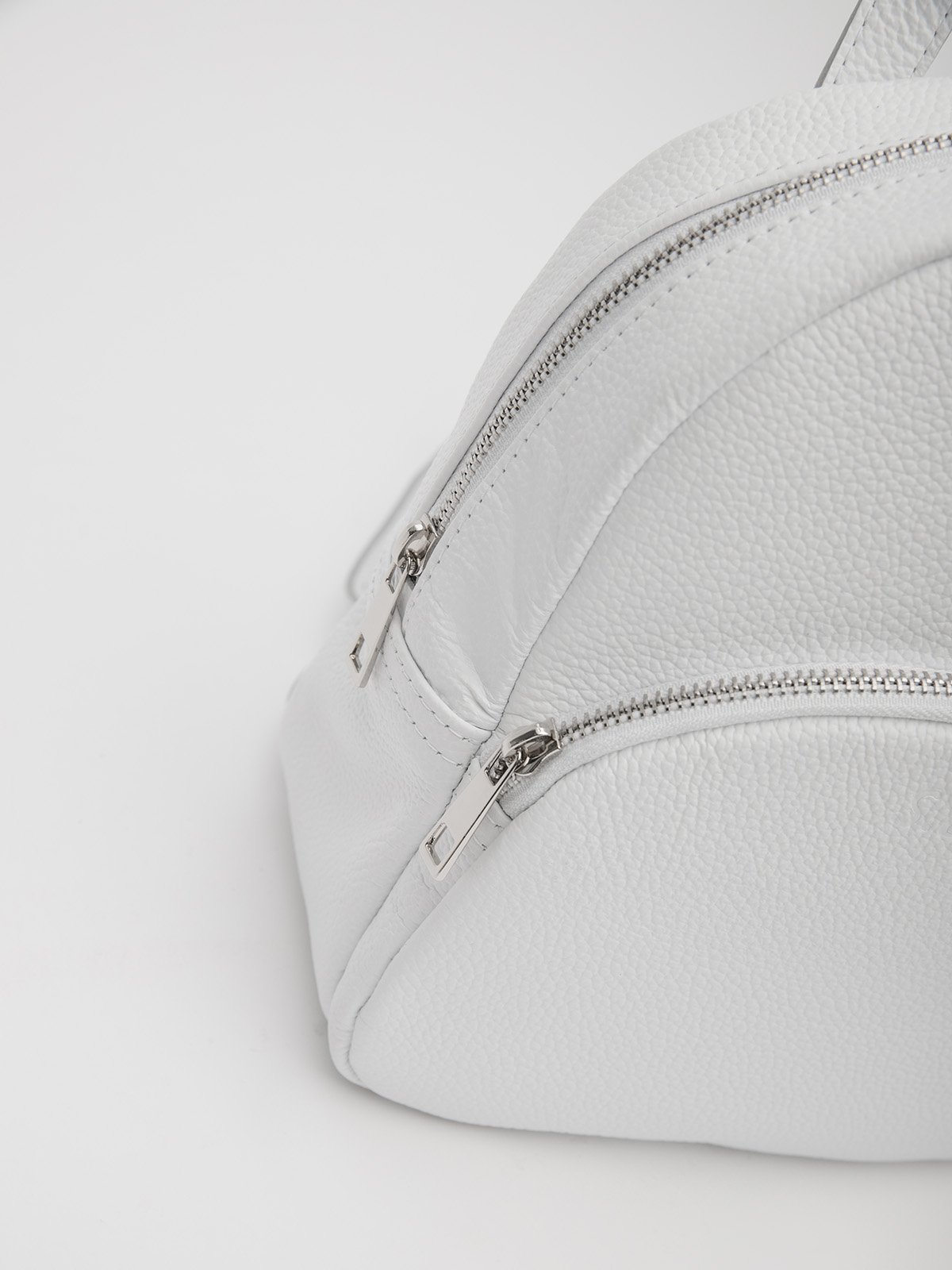 Очаровательный мини-рюкзак из натуральной кожи с жесткой округлой формой, сохраняющей стильный силуэт. Компактный, но удивительно вместительный благодаря продуманной организации: внутри — отдел с перегородкой на молнии и карман для телефона, снаружи — просторный накладной карман и вертикальный карман на молнии сзади. Удобная плоская ручка и регулируемые лямки с пряжками предлагают варианты ношения. Лаконичный дизайн с мягкими объемами подчеркивает благородство кожи.