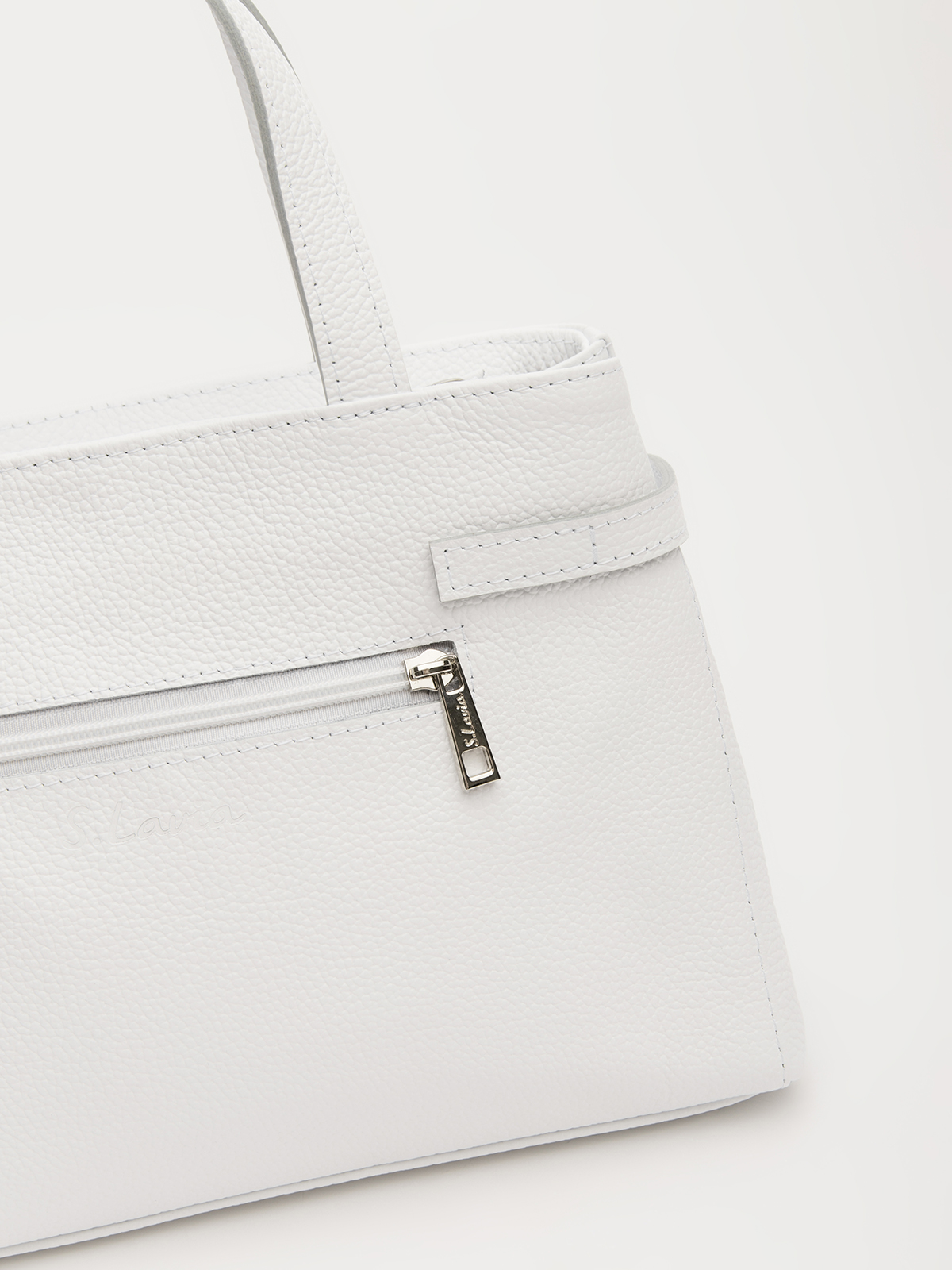 Элегантный тоут размера М, выполненный из натуральной кожи, с трапециевидным силуэтом и декоративным ремешком, опоясывающим корпус. Основное отделение с перегородкой на молнии и двумя стандартными карманами обеспечивает удобную организацию пространства. Укороченные ручки и длинный регулируемый ремень на карабинах предлагают несколько вариантов ношения. Задний карман на молнии с тиснением добавляет практичности и стиля. Идеальный выбор для тех, кто ценит лаконичный дизайн с продуманными деталями.
