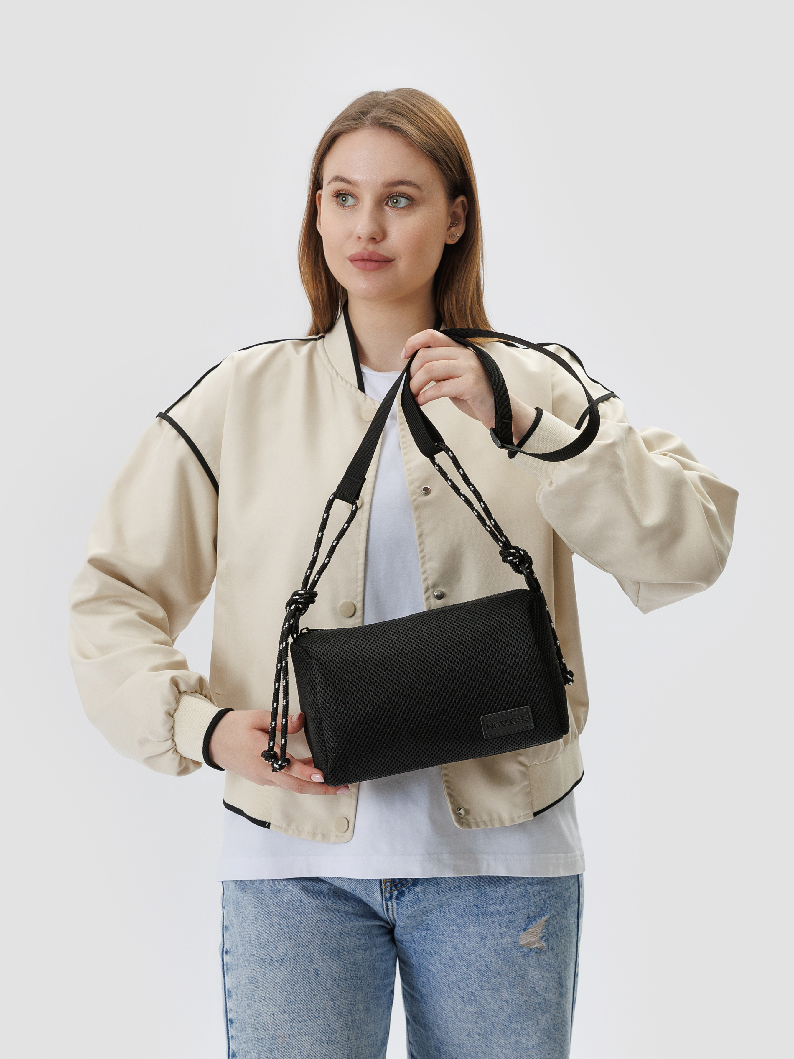 Её лаконичная форма бочонка из 3D-сетки выглядит современно и невесомо. Длинный регулируемый ремень с декоративными узлами добавляет образу лёгкую небрежность, сохраняя функциональность.