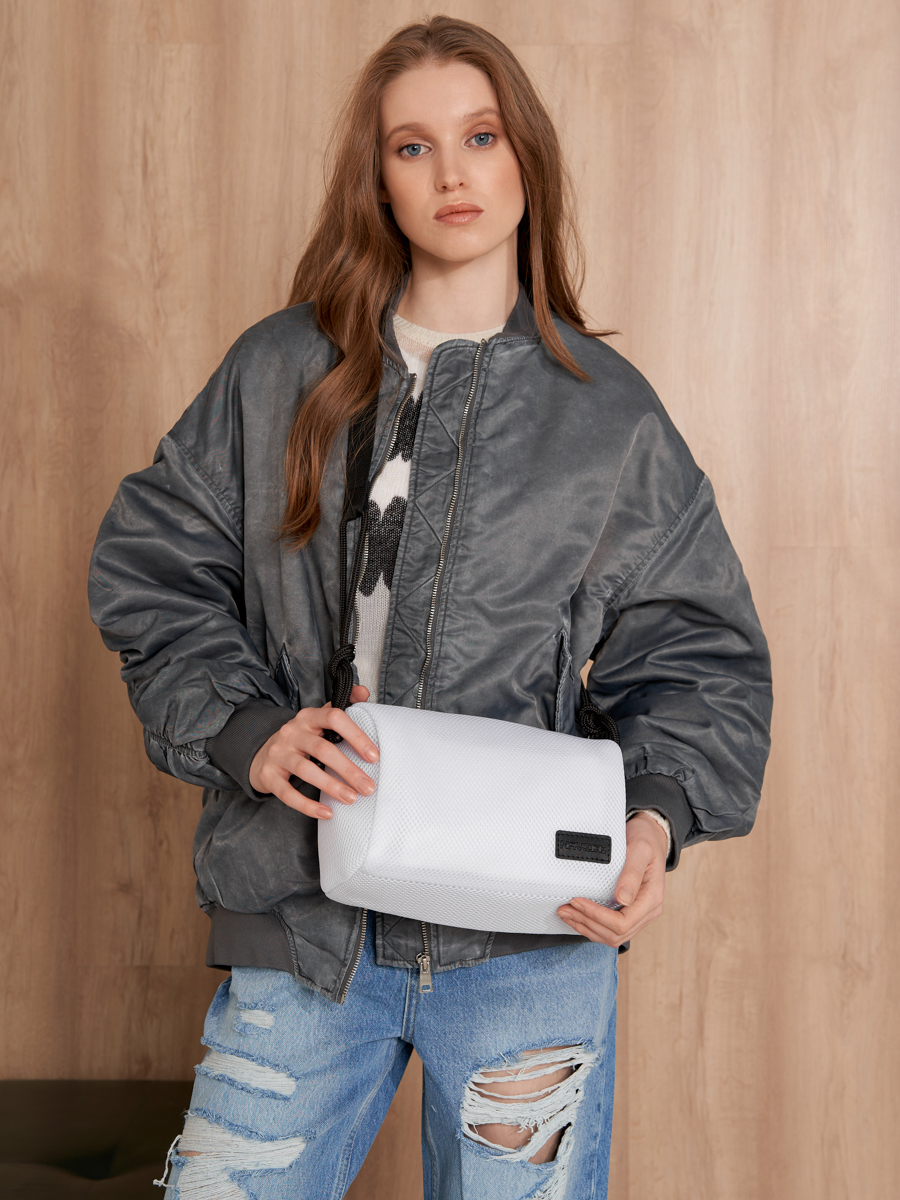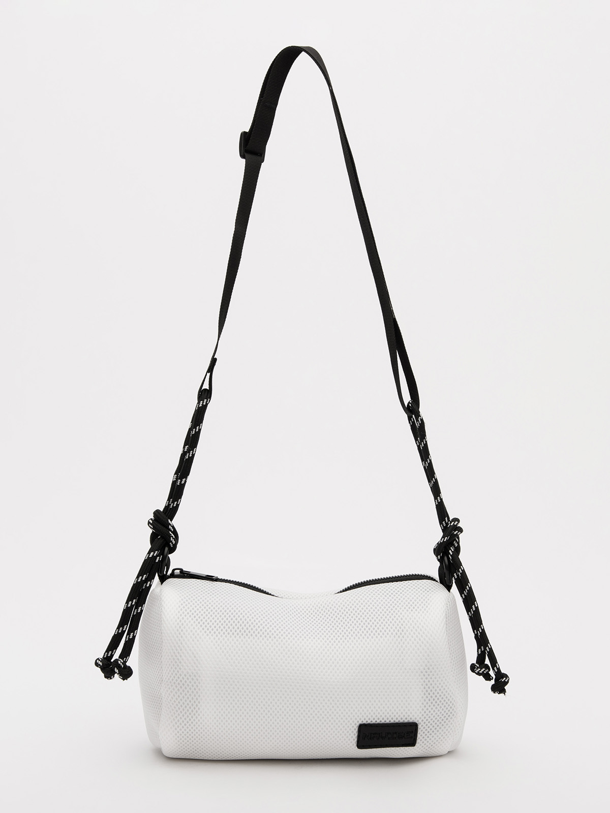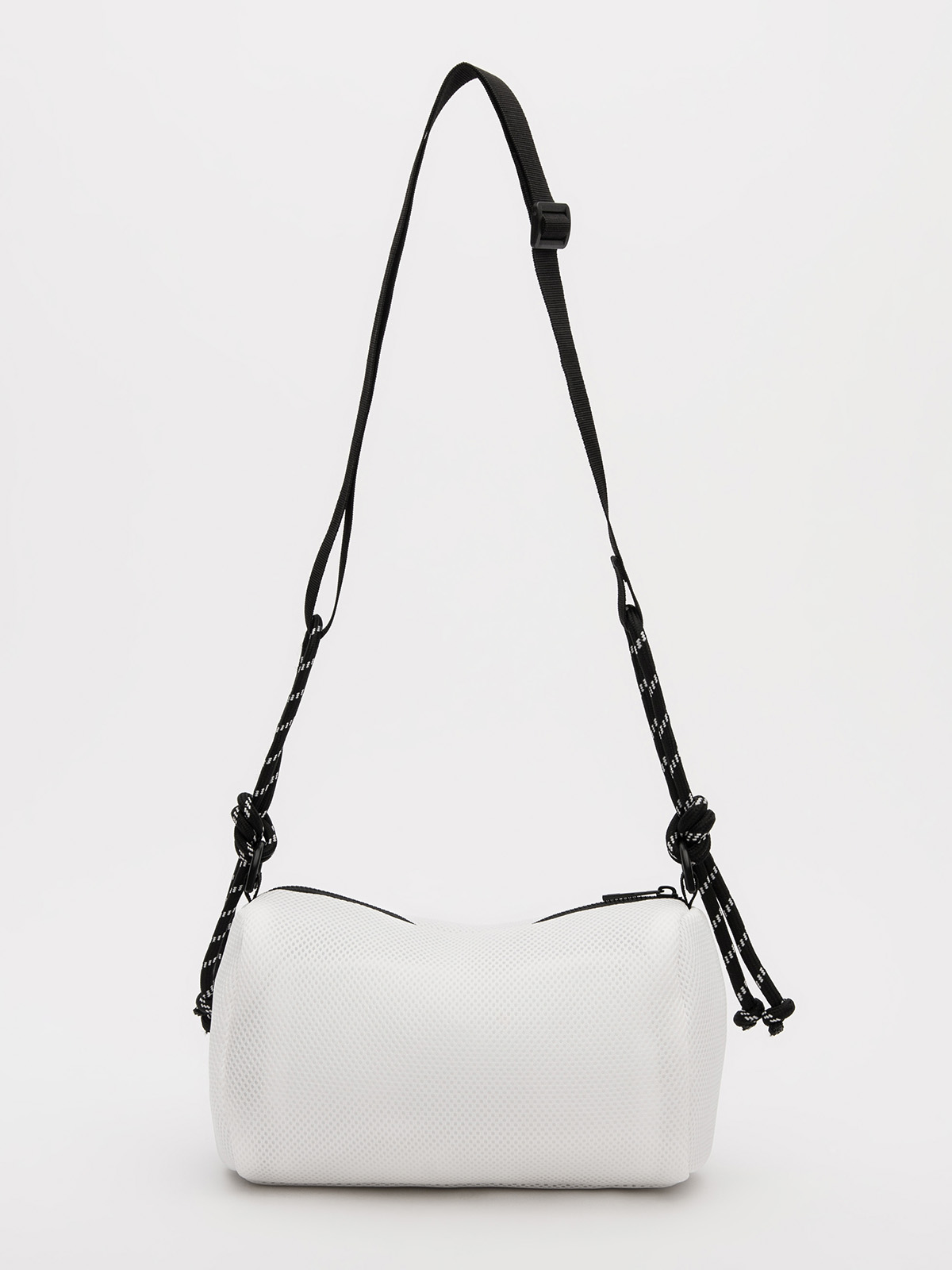 Её лаконичная форма бочонка из 3D-сетки выглядит современно и невесомо. Длинный регулируемый ремень с декоративными узлами добавляет образу лёгкую небрежность, сохраняя функциональность.