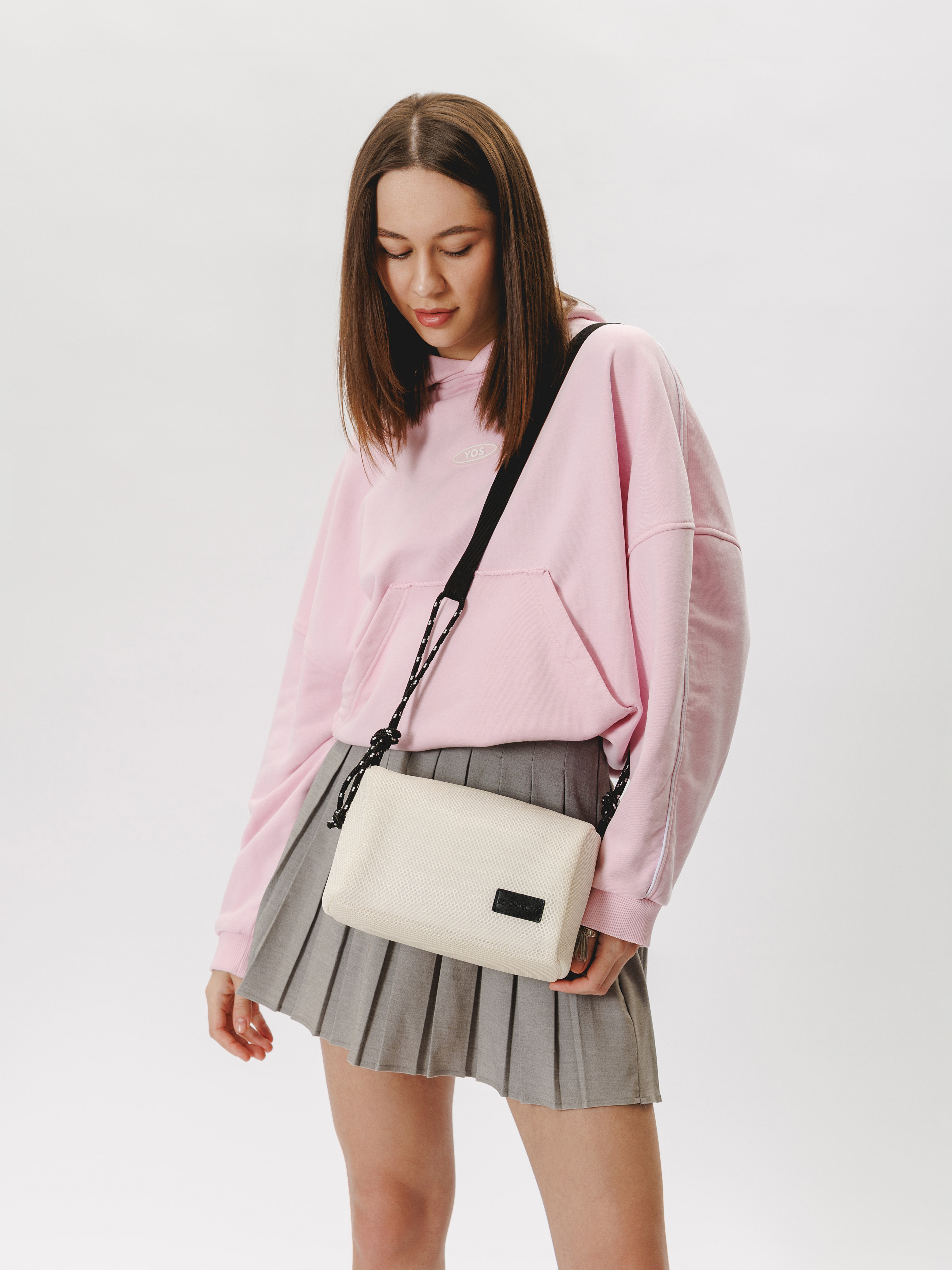 Её лаконичная форма бочонка из 3D-сетки выглядит современно и невесомо. Длинный регулируемый ремень с декоративными узлами добавляет образу лёгкую небрежность, сохраняя функциональность.