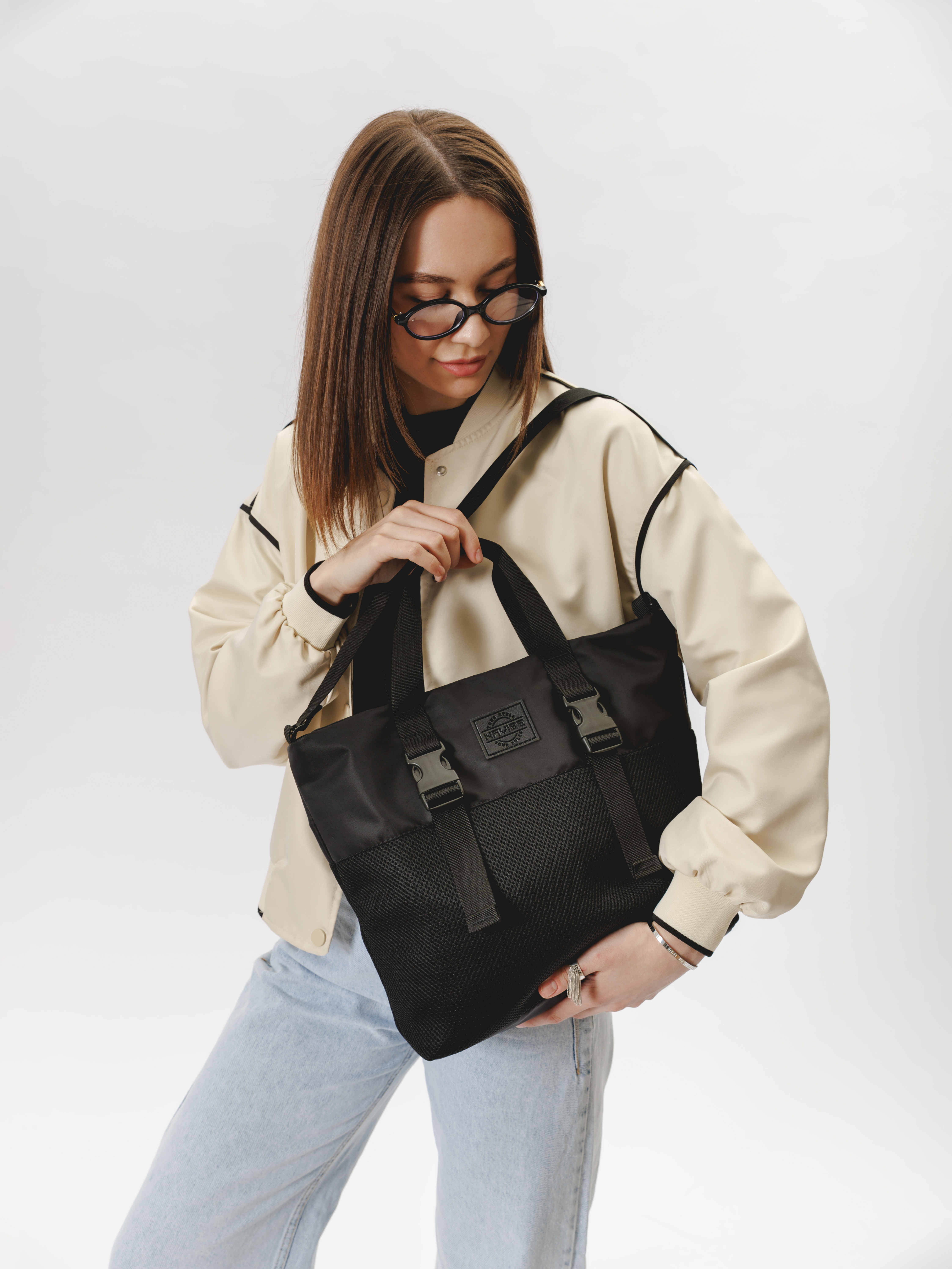 Современный тоут габарита М из объёмной сетки и твила — универсальный аксессуар для активной жизни.
