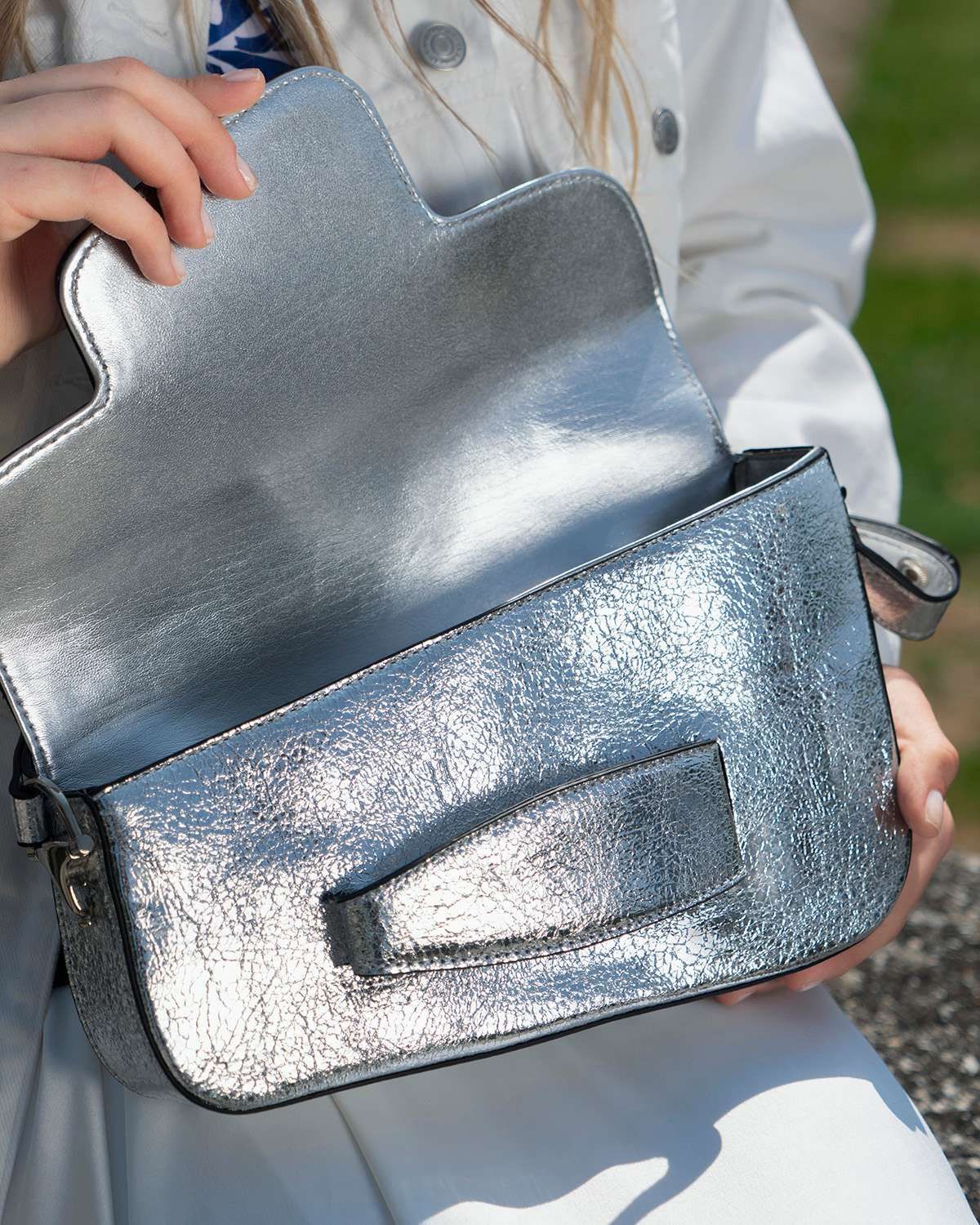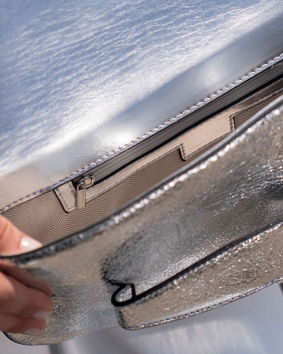 Роскошная сумочка серебристого цвета из высококачественной искусственной кожи будет неотъемлемой частью ваших стильных образов. Эта маленькая сумка багет излучает изысканность и элегантность благодаря своей фактуре с микротрещинами кракелюр, создающими особую игру света. Превосходный материал, обеспечивает долгий срок службы изделия, а также легкость в уходе. Внутри женской сумки находится удобный карман на молнии, который даст вам возможность организовать внутреннее пространство для хранения ваших вещей. Сумка цвета металлик идеально подходит для повседневного использования, а также станет прекрасным дополнением к вашему наряду на различных мероприятиях или вечеринках. Ее непревзойденный дизайн и благородный глянцевый цвет позволят вам выделиться из толпы и подчеркнуть ваш неповторимый вкус. Ширина: 8 см. Длина: 30 см. Высота: 17 см