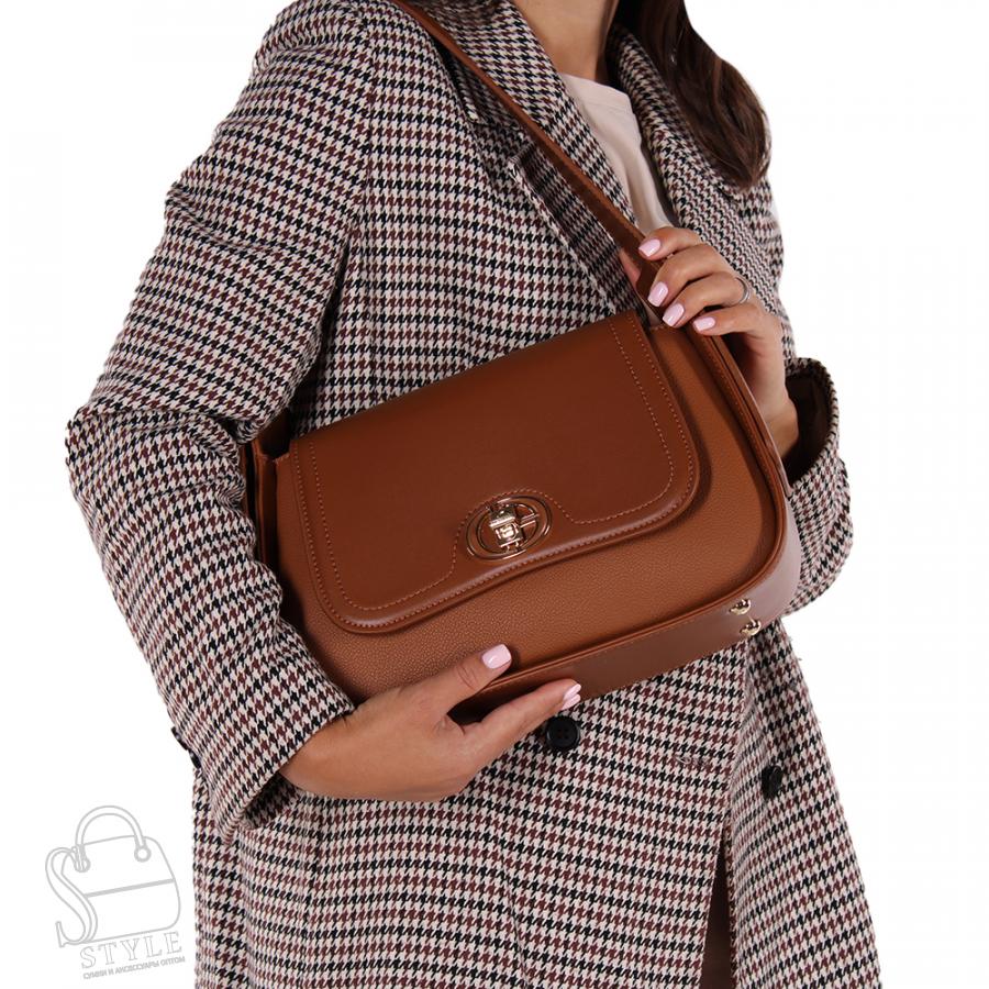 Модель сэтчел, выполнена из  экокожи. В комплекте с полноразмерным кошельком. Дополнена золотистой фурнитурой. Данная модель закрывается на клапан. Каркас жесткий. Носится в руке за встроенную ручку.