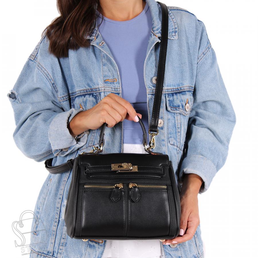 Сумка-сэтчел, выполнена из  экокожи В размере мини. Декорирована эффектной застежкой на передней части. Дополнена золотистой фурнитурой. Данная модель закрывается на клапан. Каркас полужесткий. Носится в руке за встроенную ручку или на плече. В комплекте есть ремень с регулировкой длины. На дне предусмотрены ножки.
