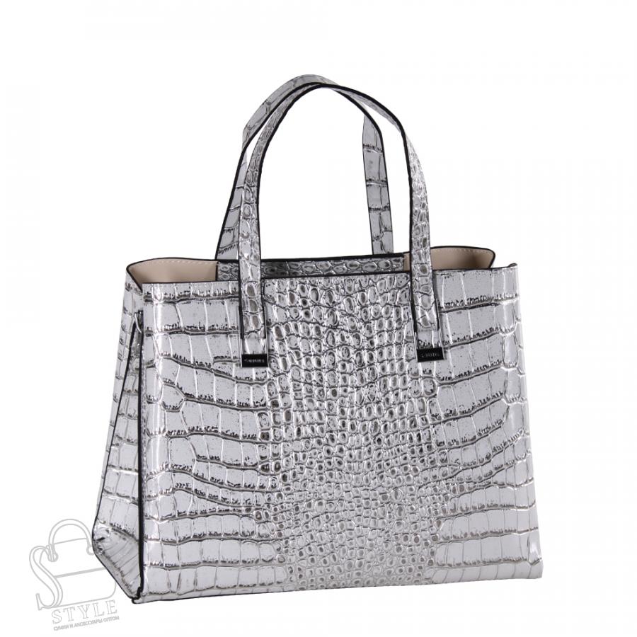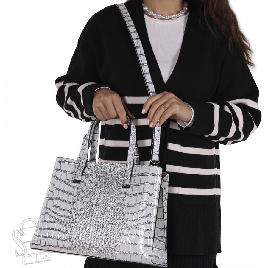 Сумка-сэтчел, выполнена из экокожи.  Декорирована перламутровым нанесением. Дополнена серебристой фурнитурой. Данная модель закрывается на молнию. Каркас жесткий. Носится в руке за короткую ручку или на плече. В комплекте имеется съемный ремень.
