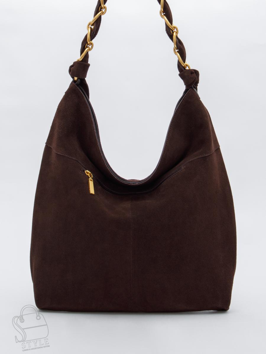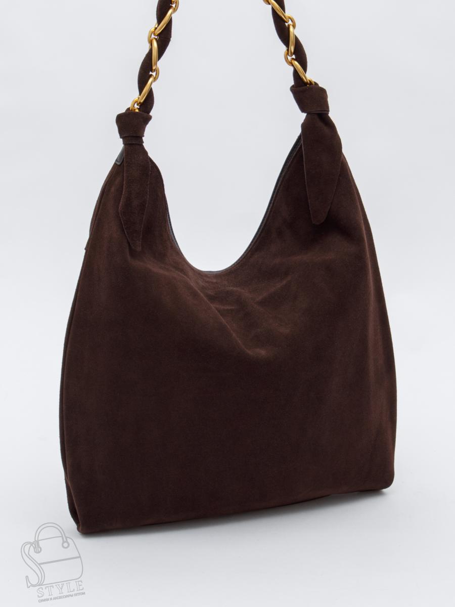 Вместительная модель, выполнена из замши. Декорирована цепочкой на ручке. Дополнена золотистой фурнитурой. Данная модель закрывается на молнию. Каркас мягкий. Носится в руке или на плече за встроенную удлиненную ручку.