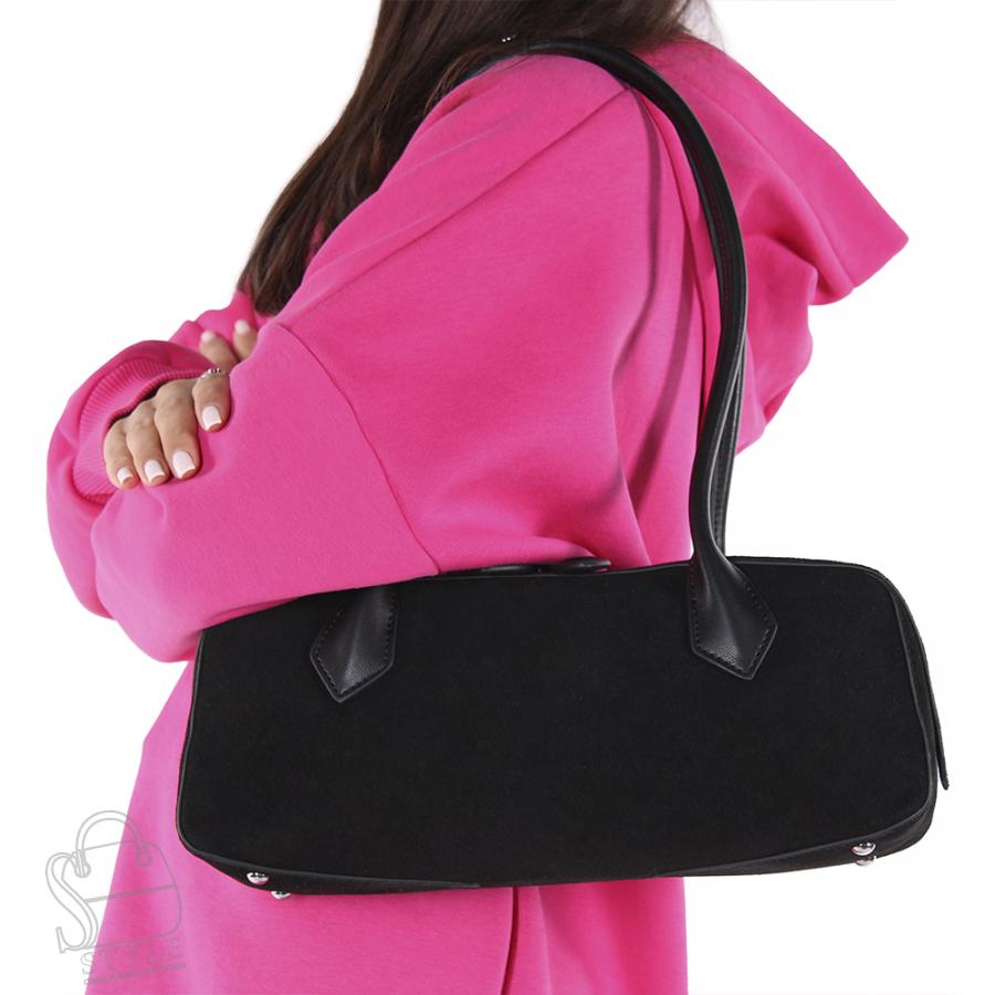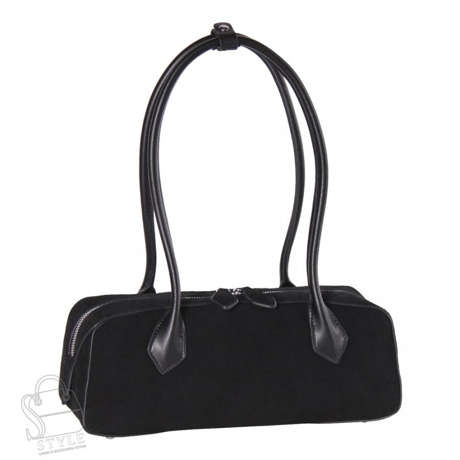 Сумка-такса, выполнена из замши. Дополнена серебристой фурнитурой. Данная модель закрывается на молнию. Каркас полужёсткий. Носится сумка в руке за встроенные ручки.