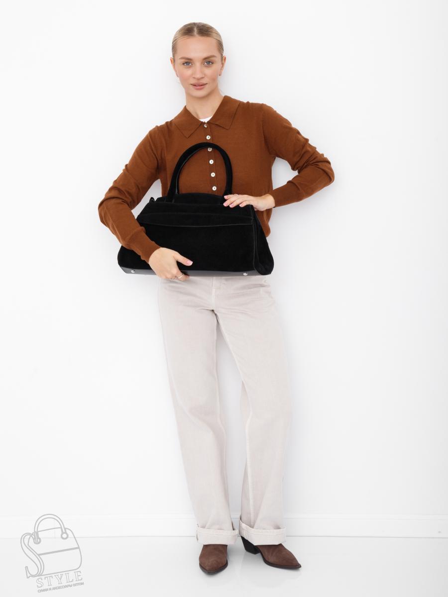 Вместительная сумка, выполнена из замши. Дополнена серебристой фурнитурой. Данная модель закрывается на молнию. Каркас жесткий. Носится в руке за встроенные ручки или на плече. В комплекте имеется съемный ремень с регулировкой длины. На дне предусмотрены ножки.