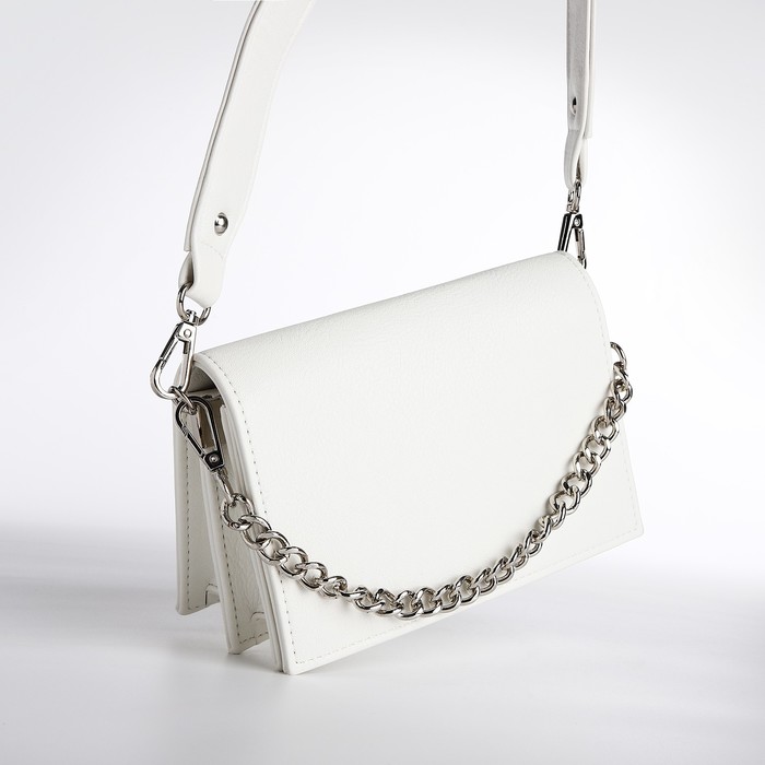 Белый цвет сумки подчёркнут серебристой фурнитурой, что придаёт ей современный и стильный вид.