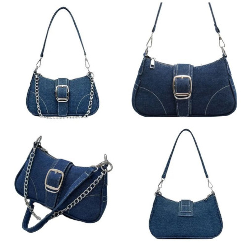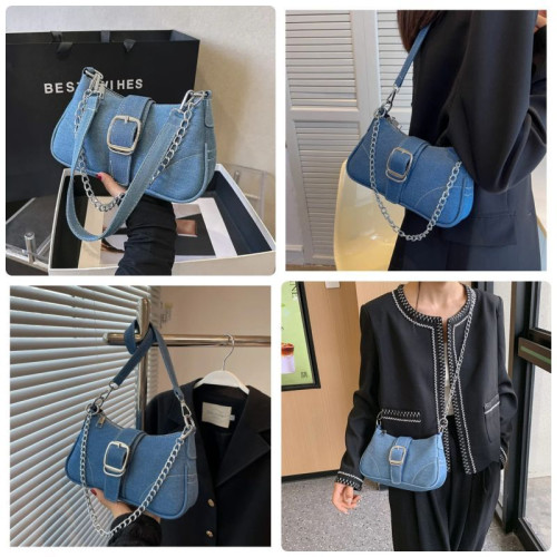 Внутри: одно отделение с карманом на молнии. Сумка закрывается на молнию и хлястик с пряжкой. В комплекте две съёмных ручки: джинсовая и цепочка, которые можно пристегнуть вместе в один длинный ремень для ношения сумки на плече. Перестёгиваемые ручки позволяют носить сумку на плече, на локте и в руке. Модель хорошо держит форму. Ровное устойчивое дно позволяет фиксировать положение сумки на поверхности.