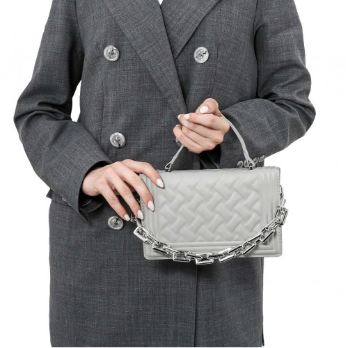 Внутри: три отделения, среднее на молнии. Сумка закрывается на крышку-клапан с двумя крепкими кнопками-магнитами. В комплекте удобная съёмная ручка-цепочка и удлинённый наплечный ремень, регулируемый по высоте. Модель хорошо держит форму.