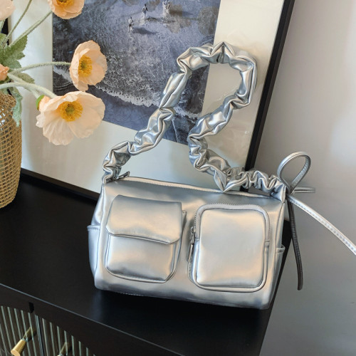 Внутри: одно отделение. Внутри расположен карман на молнии для телефона, документов и различных мелочей. На внешней передней стенке расположен карман на молнии и один карман, закрывающийся на крышку-клапан с крепкой кнопкой-магнитом. По бокам сумки расположены открытые карманы. Сумка закрывается на молнию. Длинная ручка сумки позволяет носить её в руке, на запястье, на локте и на плече.
