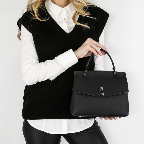 Внутри: три отделения, среднее на молнии. По бокам расположены карманы на молнии и без документов, телефона и различных мелочей. На внешней задней стенке сумки расположен карман на молнии. Сумка закрывается на молнию и крышку-клапан с поворотным замком. В комплекте удлинённый ремень, регулируемый по высоте.