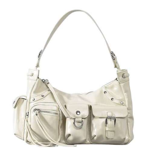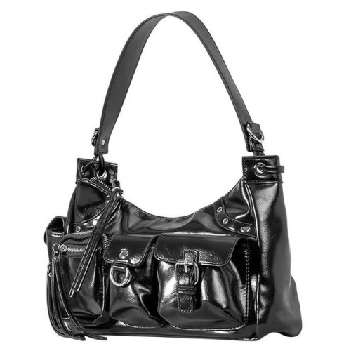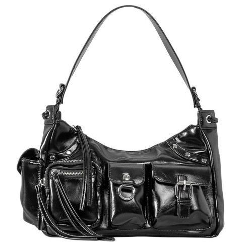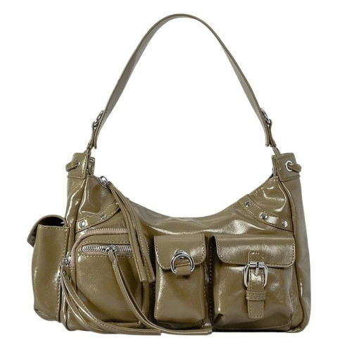 Внутри: одно отделение. По бокам внутреннего отделения расположены карманы на молнии и без для телефона, документов и различных мелочей. На внешней передней части сумки расположено три кармана: два на молнии, один с крышкой-клапаном на пряжке, один с крышкой-клапаном на крепкой кнопке магните с металлическим полукольцом для крепления брелка. На внешней боковой стороне сумки так же имеется карман, закрывающийся на крышку-клапан с крепкой кнопкой-магнитом. Сумка закрывается на молнию. В комплекте удлинённый плечевой ремень, регулируемый по высоте. Широкая ручка и ремень сумки позволяют комфортно носить её на запястье, на плече, через плечо, на локте или в руке.