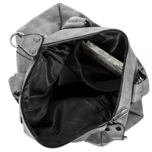 Внутри: одно большое отделение с карманами на боковых стенках - один на молнии и один открытый для телефона, документов и мелочей. На внешней задней стенке расположен один карман на молнии. На лицевой стороне два открытых кармана. В комплекте удлиненный наплечный ремень, регулируемый по высоте. Сумка закрывается на молнию.