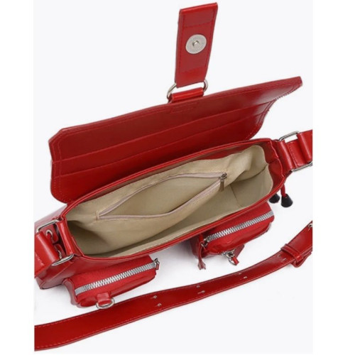 Внутри: одно отделение с открытым карманом для телефона, документов и различных мелочей. На внешней передней стенке есть два кармана на молнии и кольцо для карабина (брелок, ключи). Сумка закрывается на крышку клапан с крепким замком магнитом. В комплекте широкий удлинённый ремень, регулируемый по высоте. Модель хорошо держит форму. Ровное устойчивое дно позволяет фиксировать положение сумки на поверхности.