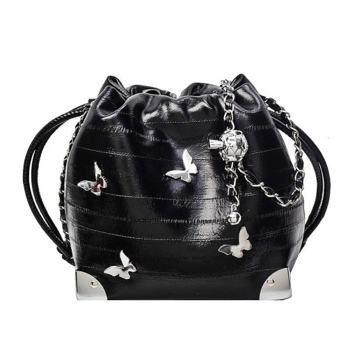 Сумка изготовлена из эко кожи высокого качества. Модель украшена бабочками, ярко бликующими на солнце и создающими лёгкое праздничное настроение. Вживую и при разном освещении сумка смотрится более эффектно, приковывая к себе взгляды.