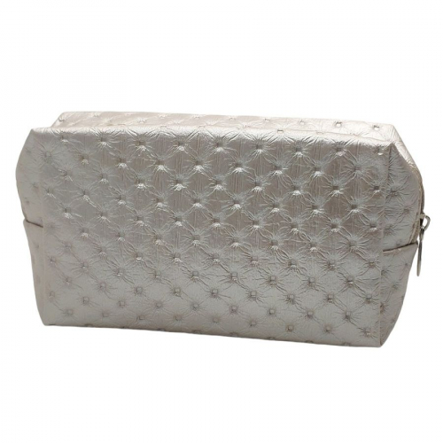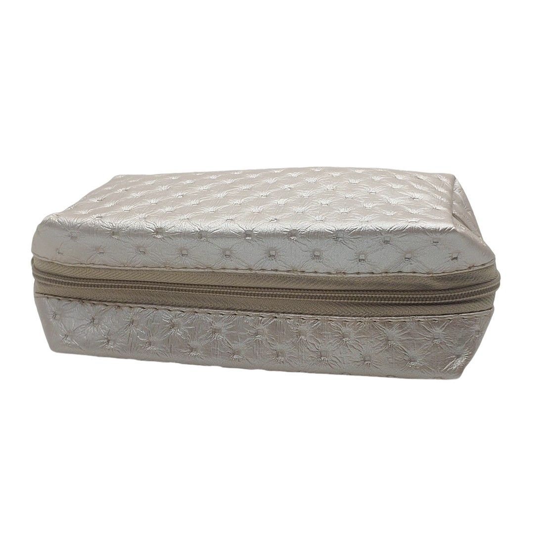 Бьюти-кейс выполнен в стильном бежевом цвете с вкраплениями серебристых блесток. Его тисненая поверхность придаёт незаменимому женскому аксессуару особый шарм.