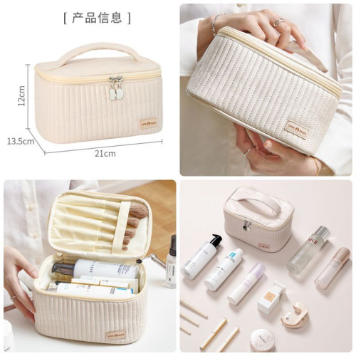 Внутри: одно отделение с кармашками для хранения и фиксации нужных предметов. Косметичка закрывается на встречную молнию. На верхней части расположена крепкая ручка, позволяющая очень удобно носить косметичку. Косметичку хорошо держит форму и её удобно брать с собой на работу, в дорогу, в путешествие, в поход, на кемпинг, в отпуск.