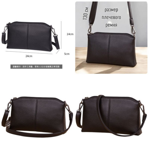 Внутри: три отделения, среднее на молнии. Внутри боковых отделений расположены карманы на молнии и без для телефона, документов и различных мелочей. Сумка закрывается на молнию. С внешней стороны на задней стенке имеется карман на молнии. Модель держит форму. В комплекте удлинённый ремень, регулируемый по высоте. Ремень сумки позволяет носить её в руке, на запястье, на локте, на плече и через плечо.