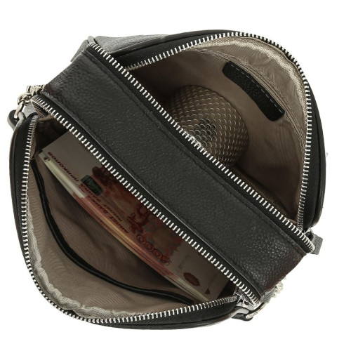Внутри: два самостоятельных отделения, закрывающихся на молнии. На боковых стенках отделений расположены карманы: один на молнии и один открытый для документов, телефона и мелочей. С внешней стороны на задней и на передней стенках так же имеются карманы на молнии. В комплекте удлинённый наплечный ремень и съёмная ручка.
