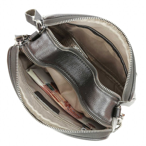 Внутри: два самостоятельных отделения, закрывающихся на молнии. На боковых стенках отделений расположены карманы: один на молнии и один открытый для документов, телефона и мелочей. С внешней стороны на задней и на передней стенках так же имеются карманы на молнии. В комплекте удлинённый наплечный ремень и съёмная ручка.