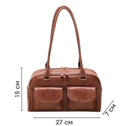 Внутри: одно отделение с карманом на молнии для телефона, документов и различных мелочей. На внешней передней стенке есть два кармана, закрывающихся на крышку клапан с крепкими кнопками магнитами. Сумка закрывается на молнию. У сумки имеются длинные ручки, которые позволяют носить её на плече, на локте или в руке. Модель хорошо держит форму. Ровное устойчивое дно позволяет фиксировать положение сумки на поверхности.