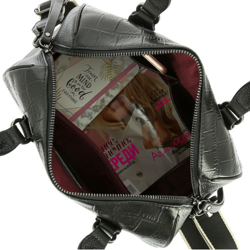 Внутри: одно большое отделение с боковыми карманами: два на молнии и три открытых для телефона, документов и мелочей. С внешней стороны на задней стенке карман на молнии. В комплекте два удлинённых наплечных ремня: один из натуральной кожи, второй из высококачественного прочного текстиля. На дне сумки расположены металлические ножки, предохраняющие от потёртостей. Модель хорошо держит форму. Сумка закрывается на встречную молнию.