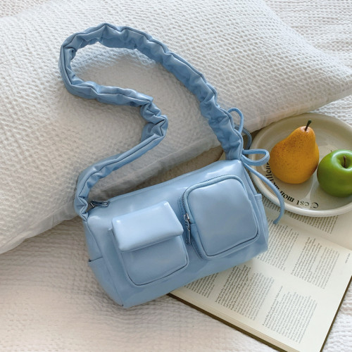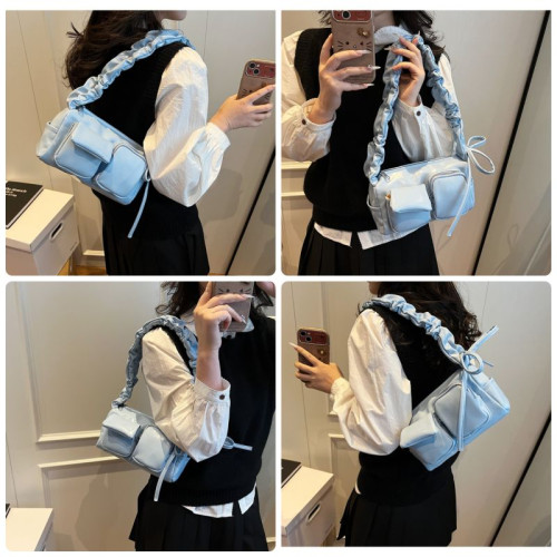Внутри: одно отделение. Внутри расположен карман на молнии для телефона, документов и различных мелочей. На внешней передней стенке расположен карман на молнии и один карман, закрывающийся на крышку-клапан с крепкой кнопкой-магнитом. По бокам сумки расположены открытые карманы. Сумка закрывается на молнию. Длинная ручка сумки позволяет носить её в руке, на запястье, на локте и на плече.