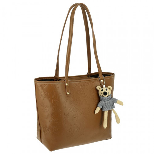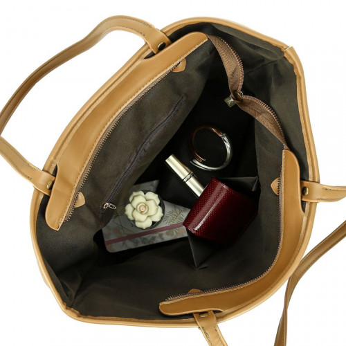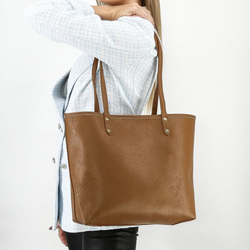 Внутри: одно большое отделение. На боковых стенках имеются два кармана: один на молнии и один открытый для документов, телефона и мелочей. Сумка закрывается на молнию. За счёт длины ручек сумку можно носить как в руке, так и на плече. В комплекте оригинальный брелок.