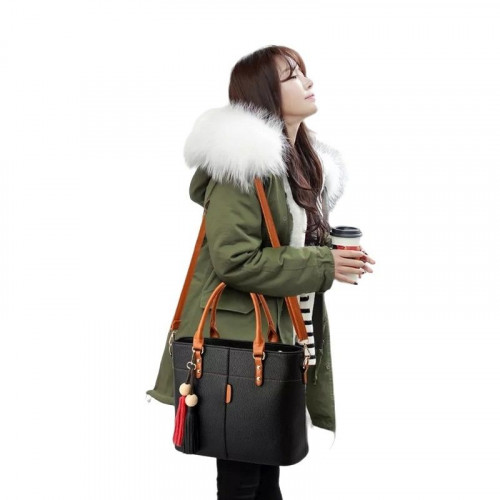 Внутри: три отделения, среднее не молнии. По бокам имеются карманы на молнии и без для документов, телефона и всяких мелочей. В комплекте удлинённый наплечный ремень. На дне сумки расположены металлические ножки, предохраняющие от потёртостей. На задней стенке имеется карман на молнии. Сумка закрывается на молнию.