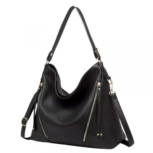 Внутри: одно большое отделение, по бокам которого расположены два кармана на молнии и без для телефона, документов и различных мелочей. С внешней стороны расположены косые молнии, которые украшают и закрывают два внешних отделения. С внешней задней стороны имеется карман, закрывающийся на молнию. Сумка закрывается на молнию. В комплекте удлиненный регулируемый ремень.