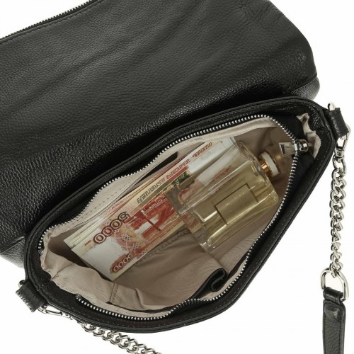 Внутри: одно большое отделение, на боковых стенках которого расположены карманы: один на молнии и два открытых для документов, телефона и мелочей. С внешней стороны на задней стенке имеется карман на молнии. В крышке-клапане так же размещается вместительный карман на молнии. В комплекте съёмная ручка и удлинённый, регулируемый по высоте, наплечный ремень. Сумка-клатч закрывается на молнию и крышку-клапан с двумя крепкими кнопками-магнитами.