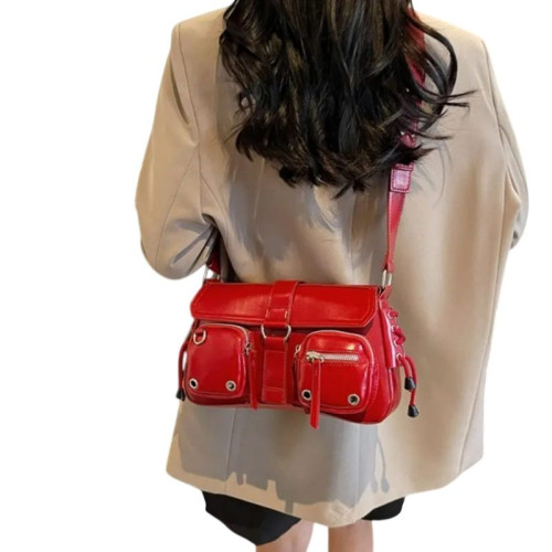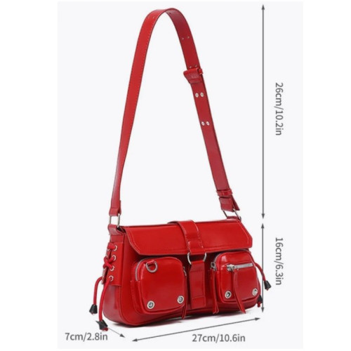 Внутри: одно отделение с открытым карманом для телефона, документов и различных мелочей. На внешней передней стенке есть два кармана на молнии и кольцо для карабина (брелок, ключи). Сумка закрывается на крышку клапан с крепким замком магнитом. В комплекте широкий удлинённый ремень, регулируемый по высоте. Модель хорошо держит форму. Ровное устойчивое дно позволяет фиксировать положение сумки на поверхности.