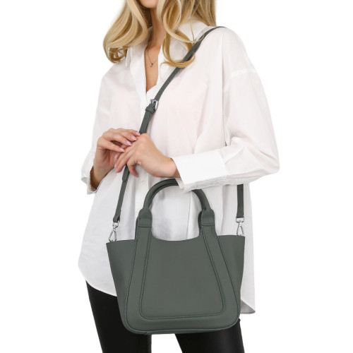 Внутри расположен съёмный органайзер, который крепится к сумке крепкими кнопками. Органайзер закрывается на молнию. В комплекте удлинённый наплечный ремень, регулируемый по высоте. Модель хорошо держит форму. Сумка закрывается на молнию и крепкую кнопку-магнит.